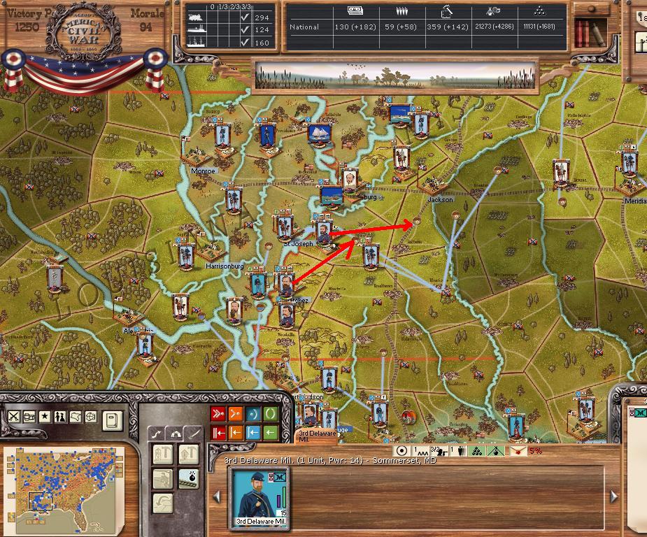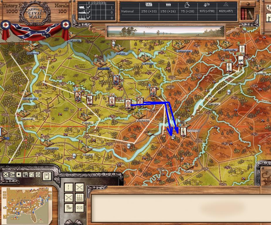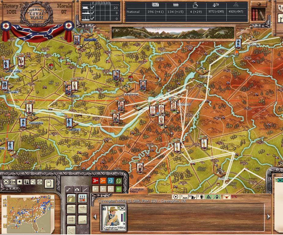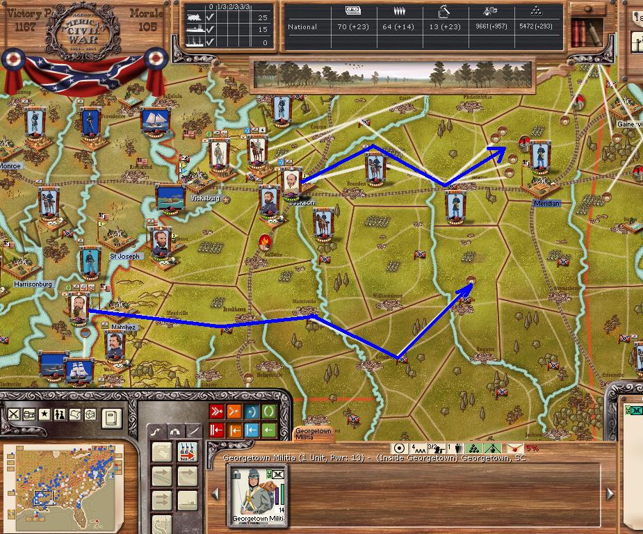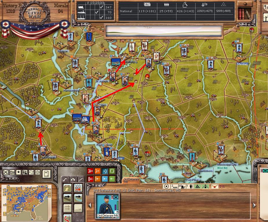 Purchases - 9 5 - element NY Brigades and 5 OH mixed brigades, 3 sharpshooter, 1 cav, 3 artillery, 2 ocean transports - East - I want to cut off the AoNV into pieces, hopefully they are so short of supplies they have no offensive capabilities. Continue to expand coastal landings. West - move over the river at Mason, AL for move on Chattanooga, supply line behind AofTenn should be well cut up. Want to take Jackson and prepare for move on Mobile. Far West - Little Rock will have to wait a few turns, but starting minor moves into TX.
