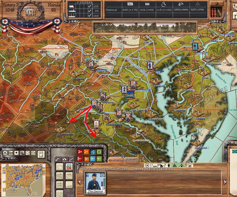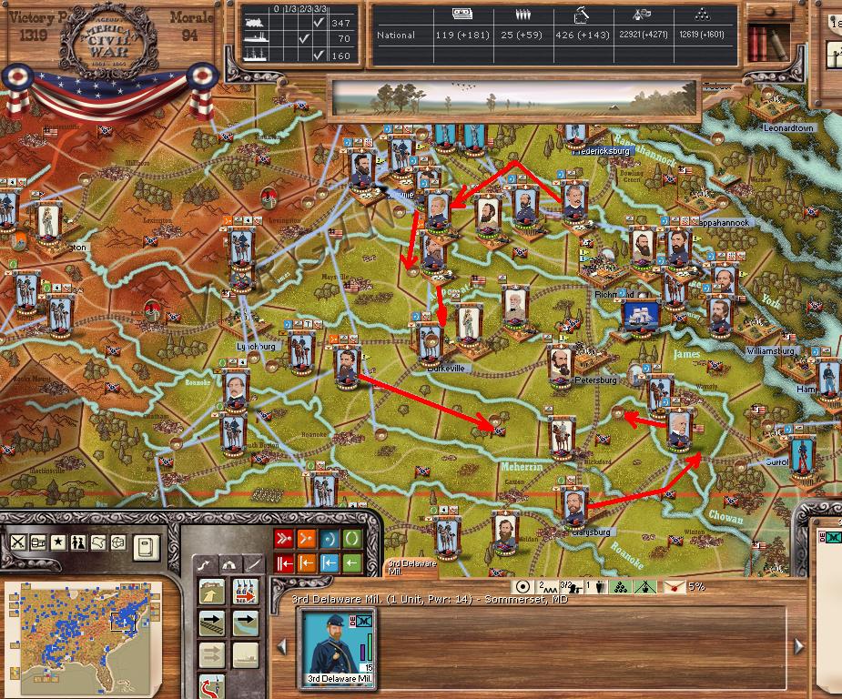 Purchases - locomotives and 8 militia for rail protection. East - He moved back from my flanking movement and going to repeat the move this turn and work closer to Richmond. Starting movement from Norfolk and Ft Monroe to add fronts for him to defend. Bringing Cav forward some for anti-partisan duty, some for large raids. West. AofCumberland, advancing to Stevenson, AL where I will set up a depot and then withdraw most of the Army to another front. MS Command advancing a few regions and Grant still trying to get across the MS. Far West. Ft Smith taken, preparing for move on Little Rock. Butler just messing around in TX/LA