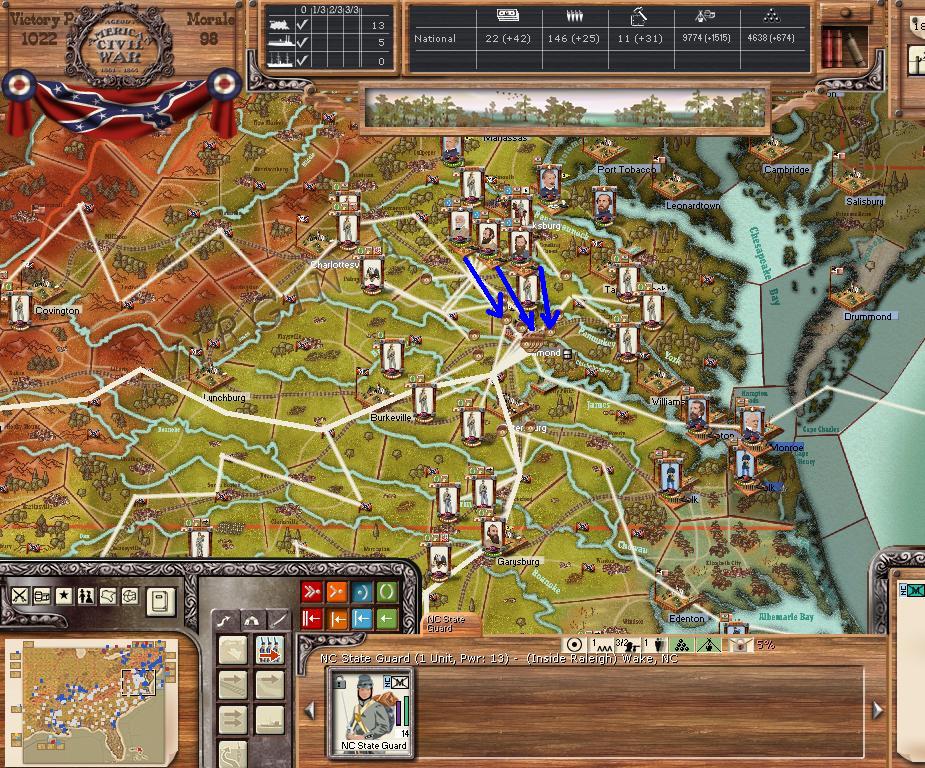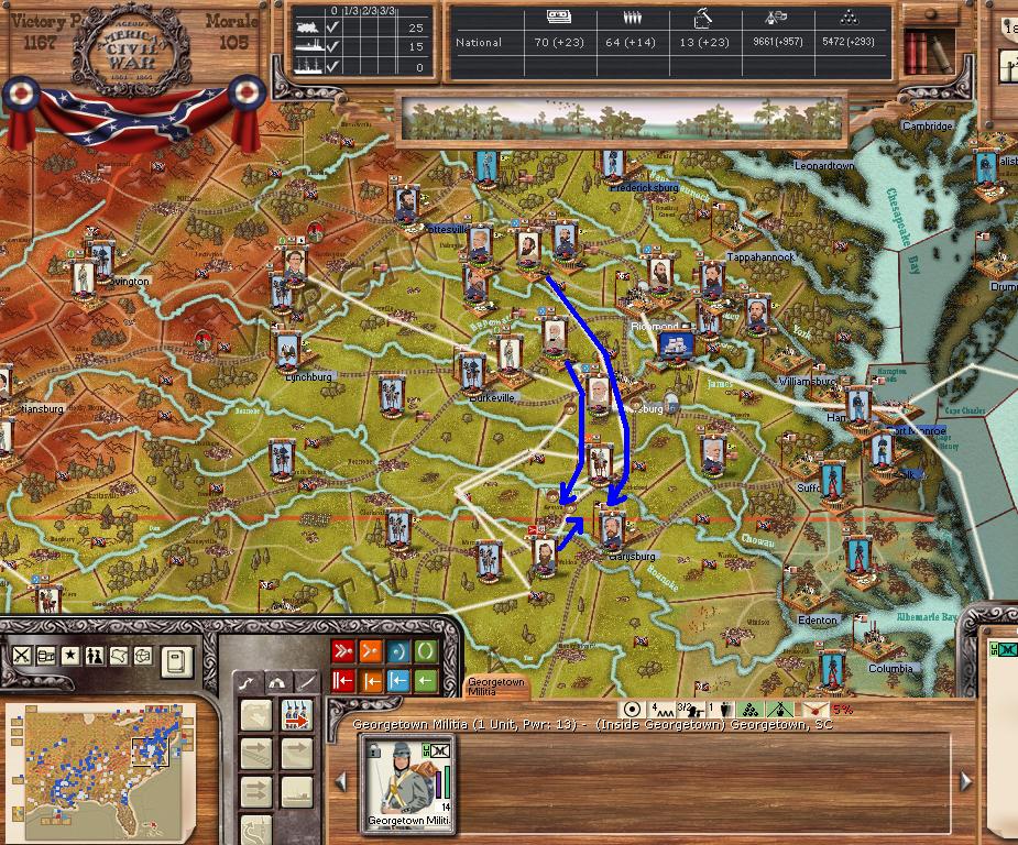 Purchases, river transport, a few replacements and one mixed brigade. East - Tightening ring around Richmond/Petersburg. Continueing deep cav raids and moving forces out of landings at beaufort and beaufort. He has to be hurting for supplies by now, he either has to attack out of Richmond or starve to death. West - raids raids raids, recovering from my attack on Jackson, having a go at Vicksburg now. Consolidating the rest. Far west - begining move towards little rock and consolidation.