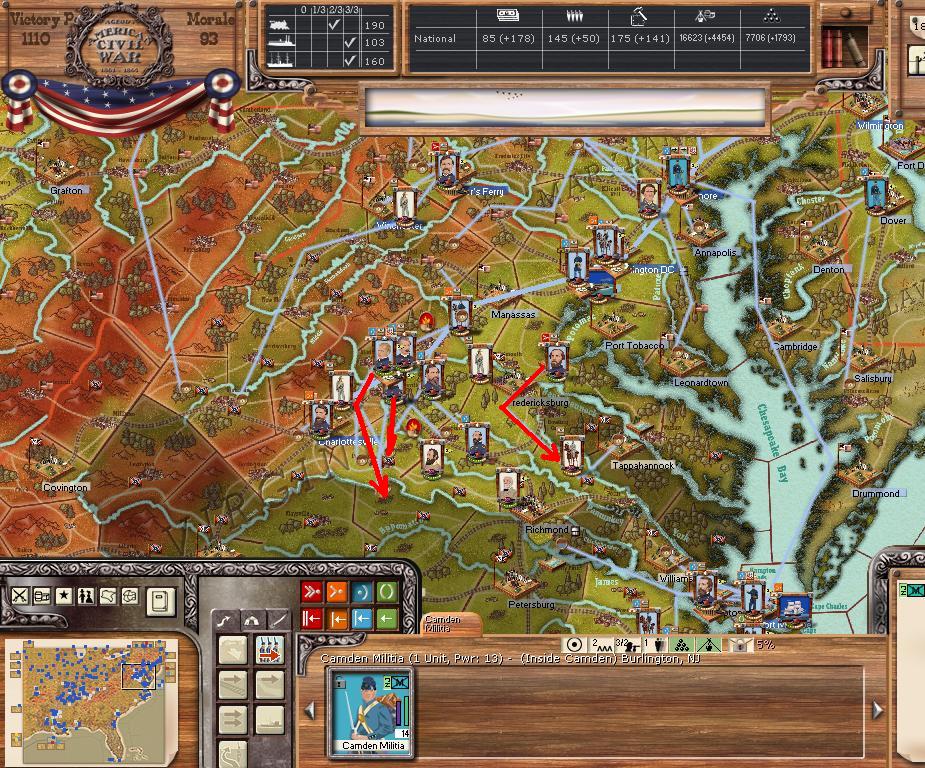 The Army of Potomac has tried to flank my Army of Northern Viriginia, throughout Charlottesville, Albermalle and Louisa, but I was able to retreat to better positions around Richmond and 1 detached cavalry brigade has blown my depot at Fredericksburg, because this position is undefensible.