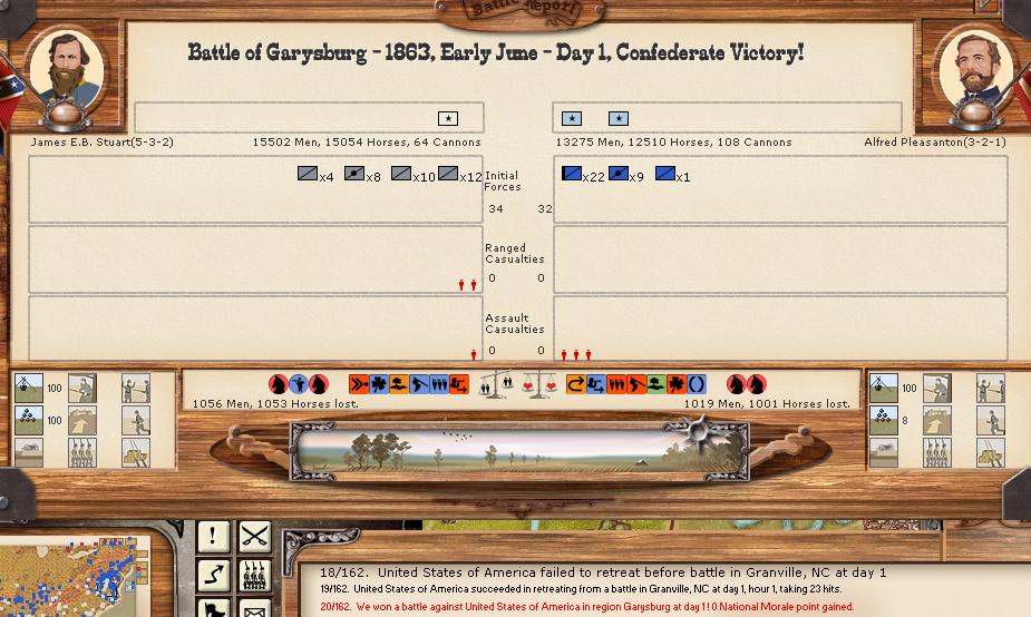 There were 6 minor and 1 major battles this turn. Vicksburg was able to bombard a union fleet and cause 50 hits, while being hit 0 in return.