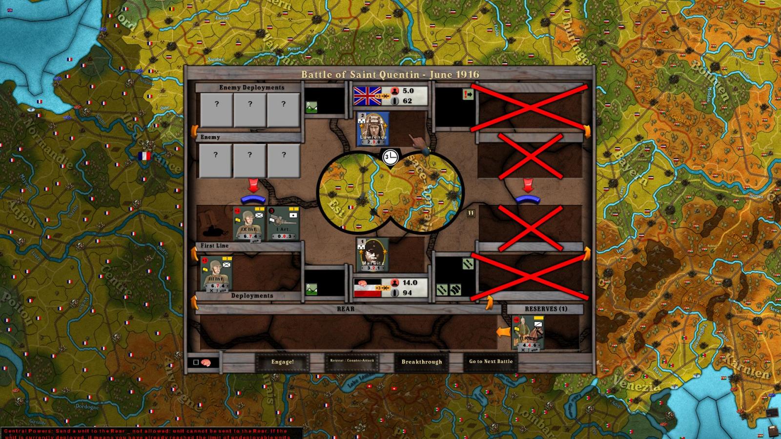 patrat wrote:in at least 3 battles in one turn with me defending, my rear line was already packed with troops when the battle screen poped up. there should of been only 2 corps in the rear line at the start of those battles not 6 or more, because 2 is the max number of corps i had in any of those regions. the extra troops seemed to me to be not only reserves troops which didnt belong there (at least not until i move them there), but also troops from neighboring regions. im not 100 percent sure of that last part, its hard keeping all those corps straight.![]()