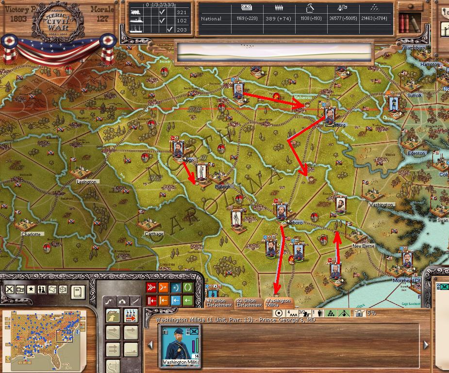AOP attacks SW towards Florence SC (attacking through Longstreet. and Lee). AOC holds position. AOT moves east into Georgia.