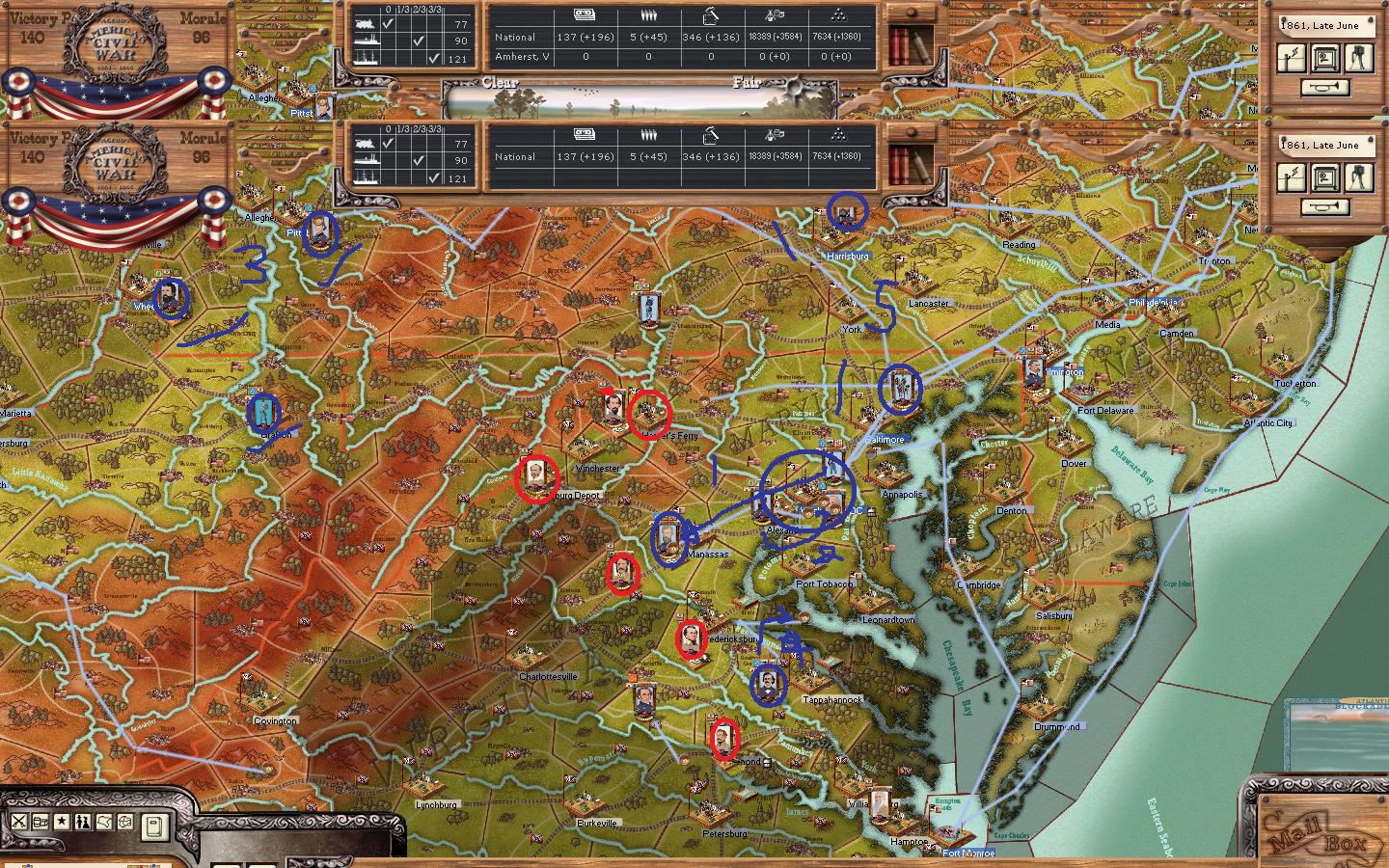 4 - Start establishing line of defence in northern WV - it's a good springboard to launch an offensive from - I want to try and build a decent sized force here - as it will be the extreme flank of my Eastern forces - also covering the eastern edge of my central area. Covington is an early target for this force to look to - as that can be a great springboard to invade VA and beyond.