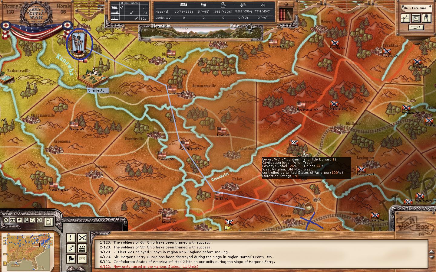 4 - Start establishing line of defence in northern WV - it's a good springboard to launch an offensive from - I want to try and build a decent sized force here - as it will be the extreme flank of my Eastern forces - also covering the eastern edge of my central area. Covington is an early target for this force to look to - as that can be a great springboard to invade VA and beyond.