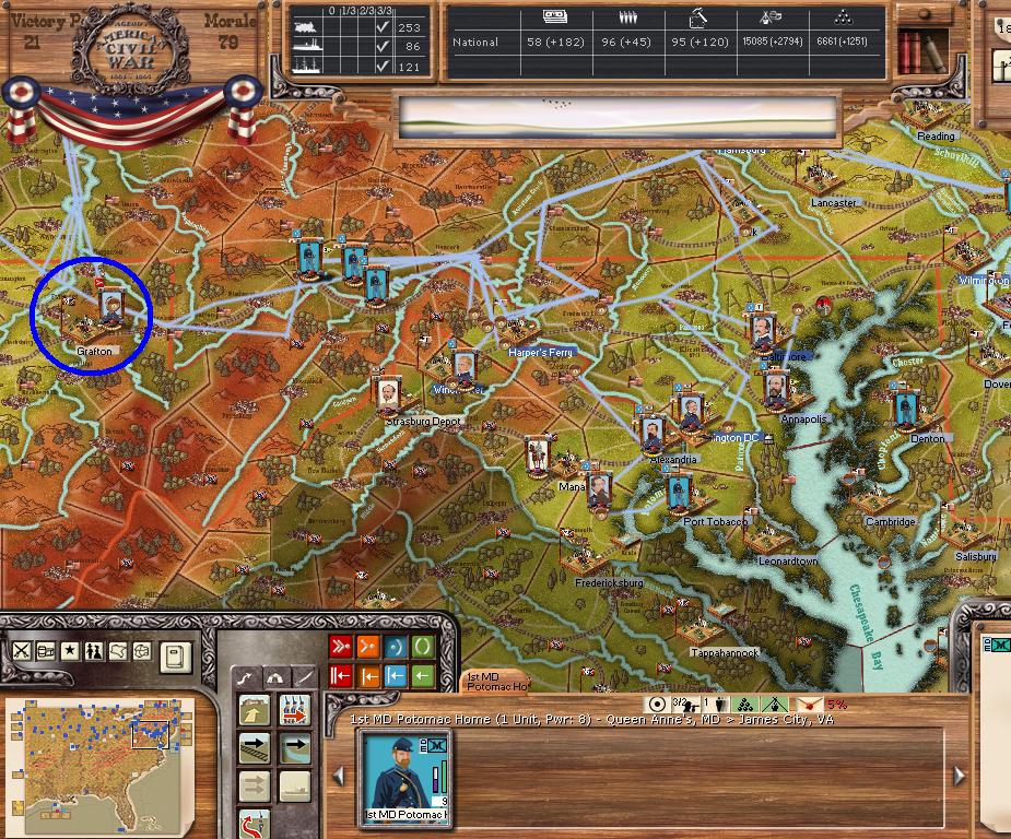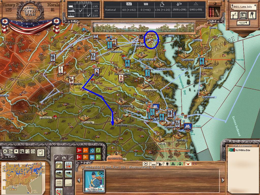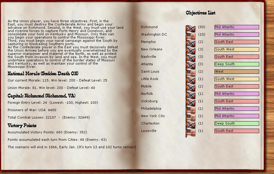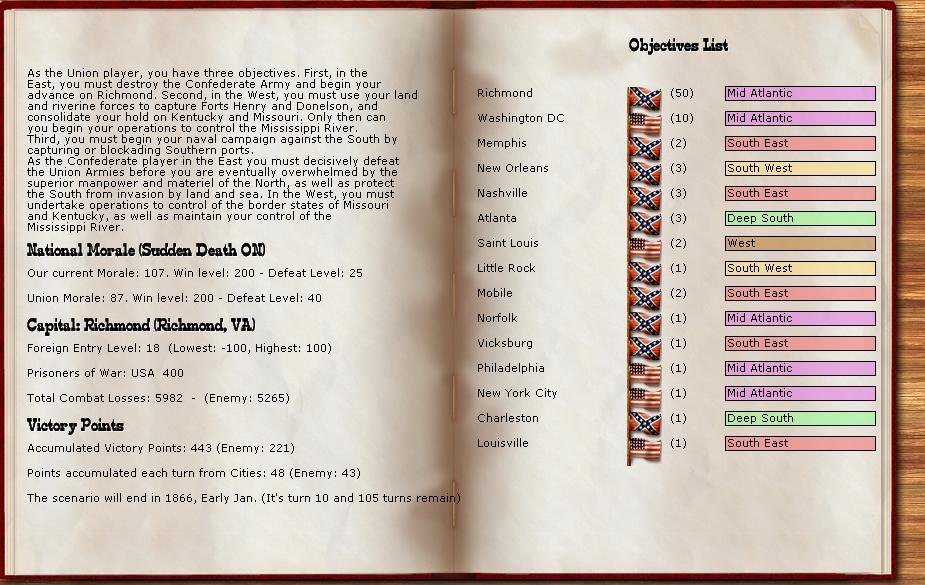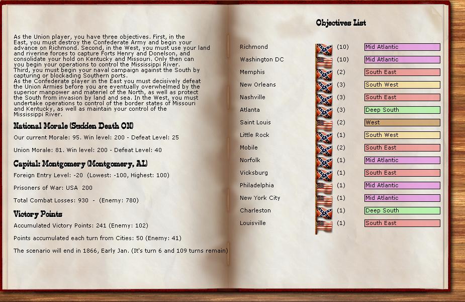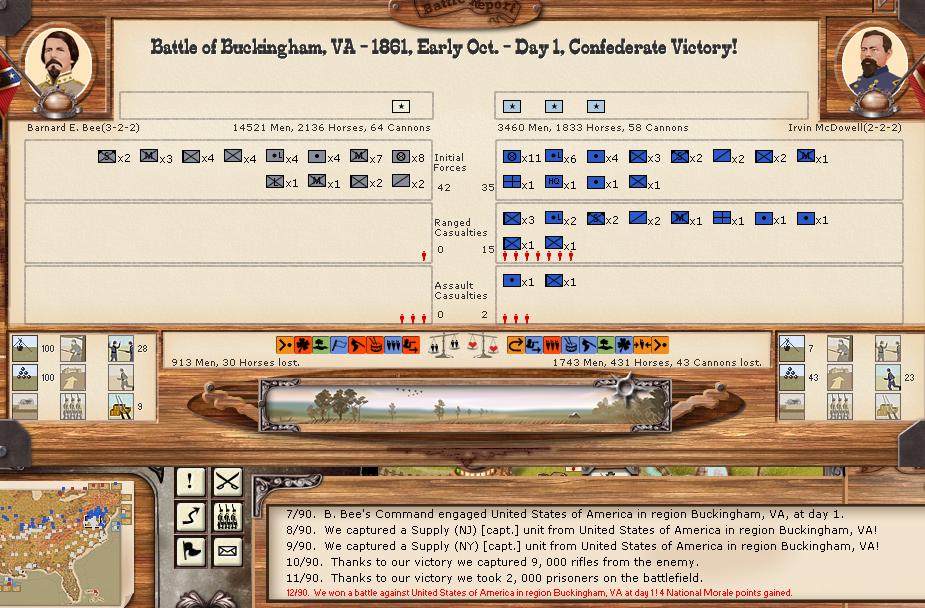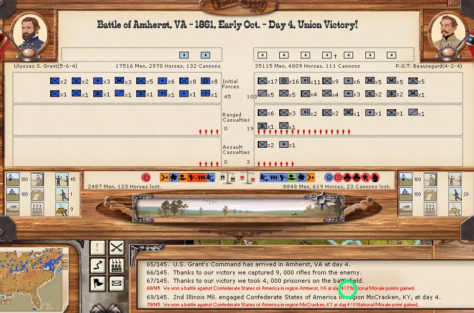 Jackson's command was smacked really hard by Grant on day 4. They took the brunt of the damage from Grant (even though the AOP was in the same area). The CSA's Edmund Smith was KIA during the battle of Amherst. The net effect of the battles in the east are +2 NM for the Union (not including the +1 for holding Norfolk). And now the results: