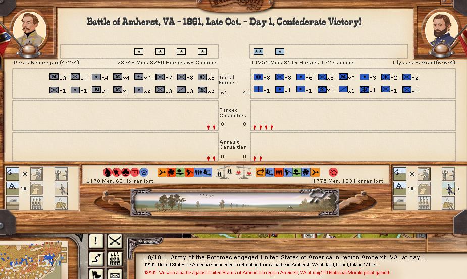 There were 6 minor battles this turn. The major battle happened in Amherst VA, where the AOP under Bory forced Grant to retreat (which was his original intent). The losses on that battle where nearly identical.