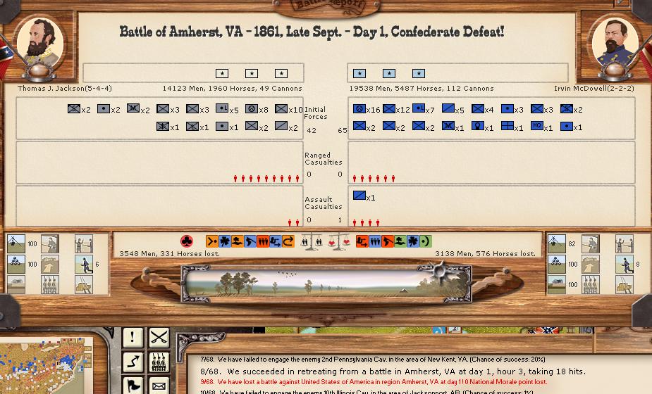 There were 6 minor battles this turn. The major battle happened in Amherst VA, where the AOP under Bory forced Grant to retreat (which was his original intent). The losses on that battle where nearly identical.