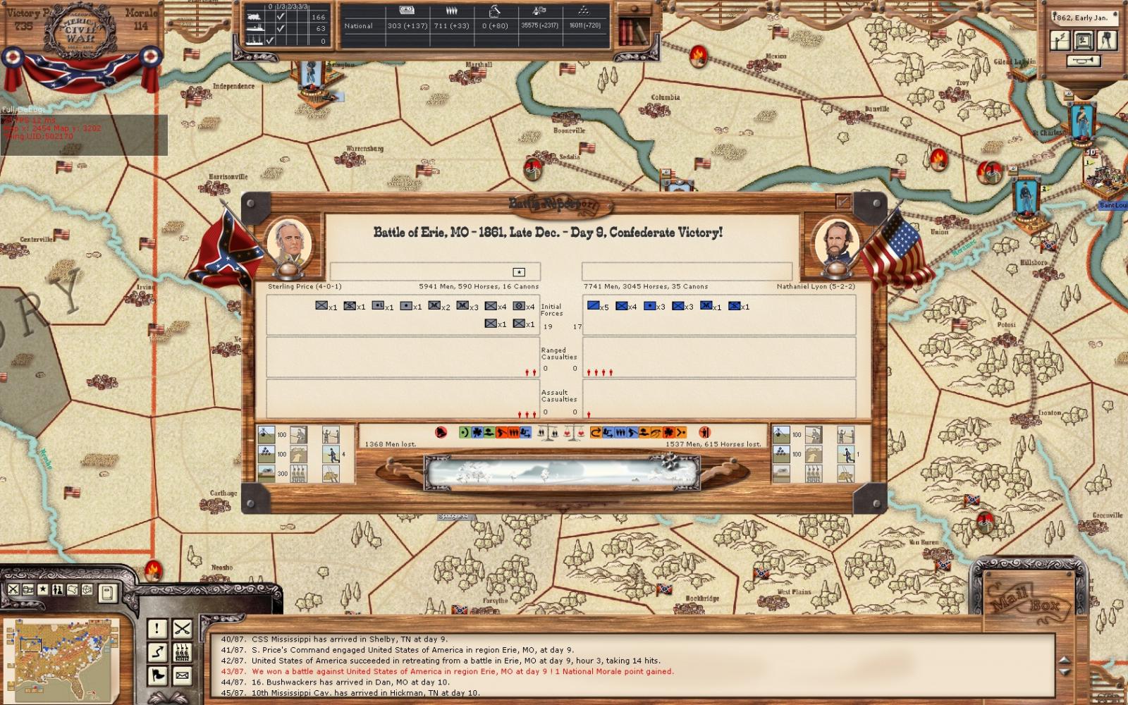Bragg and AJ are sitting firm at Bowling Green. Bragg is getting his promotion to 2 star general. Forrest at Forts Henry and Donnelson will continue to build his division. Hardee is in a good position, with weather and terrain to help on defense. Mculloch is good at Memphis having been reinfored with the Missouri elite brigade to supplement his cavalry. Other forces are marshalling at Nashville. Grant will do good to withdraw North. I don't see him moving deeper becasue of the weather and threats to his supply lines.