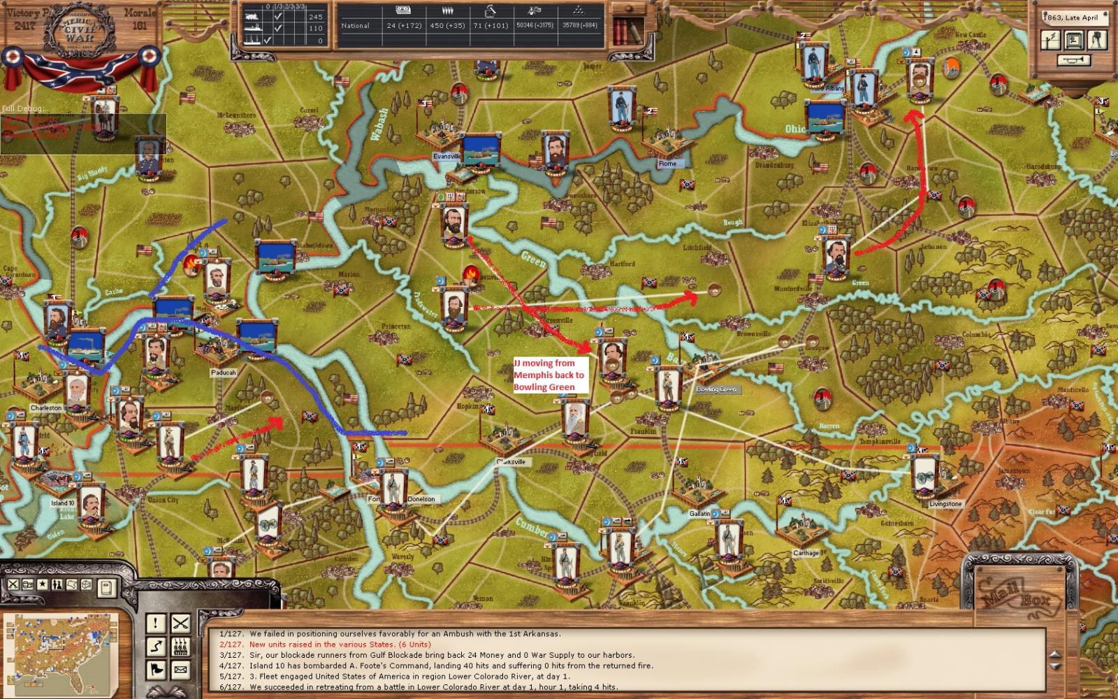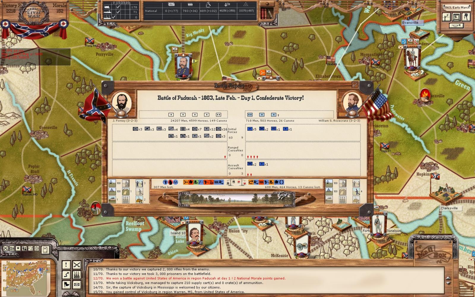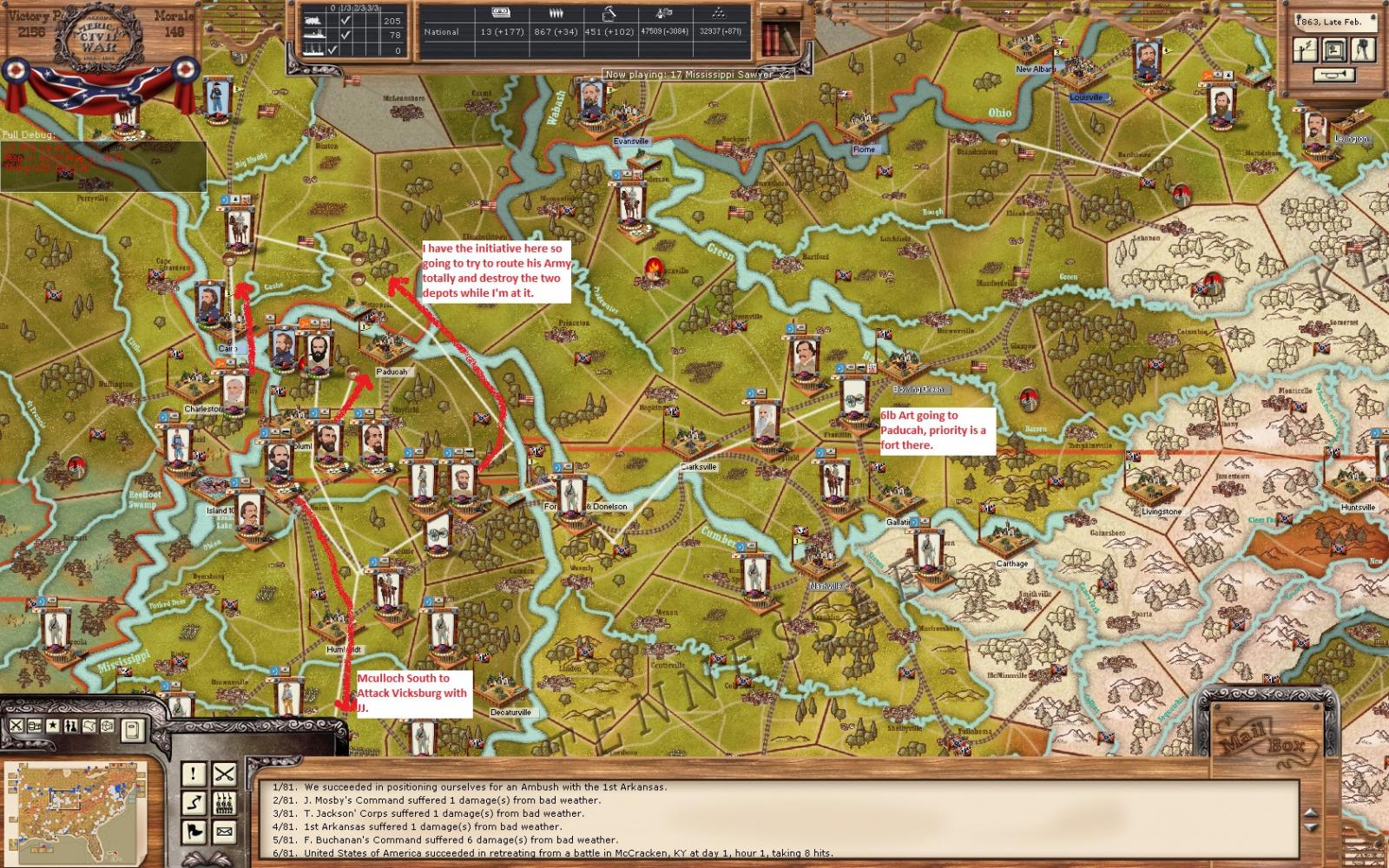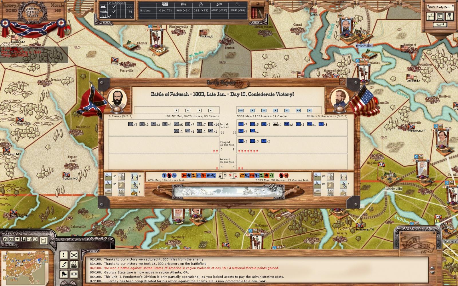 veji1 wrote:wow. I just read the reports at the bottom of the screenshots and it looks like you have made 38 000 prisonners in western Kentucky in this campaign, with 36 000 of those in Paducah. This is a major disaster for your opponent, you just basically did to him the equivalent of capturing Fort Donelson and Vicksburg at the same time !!