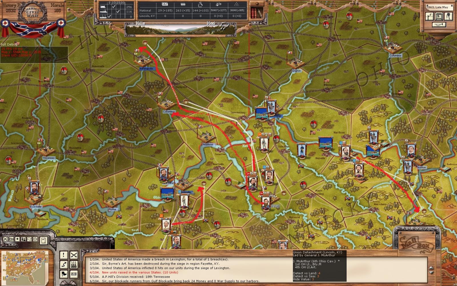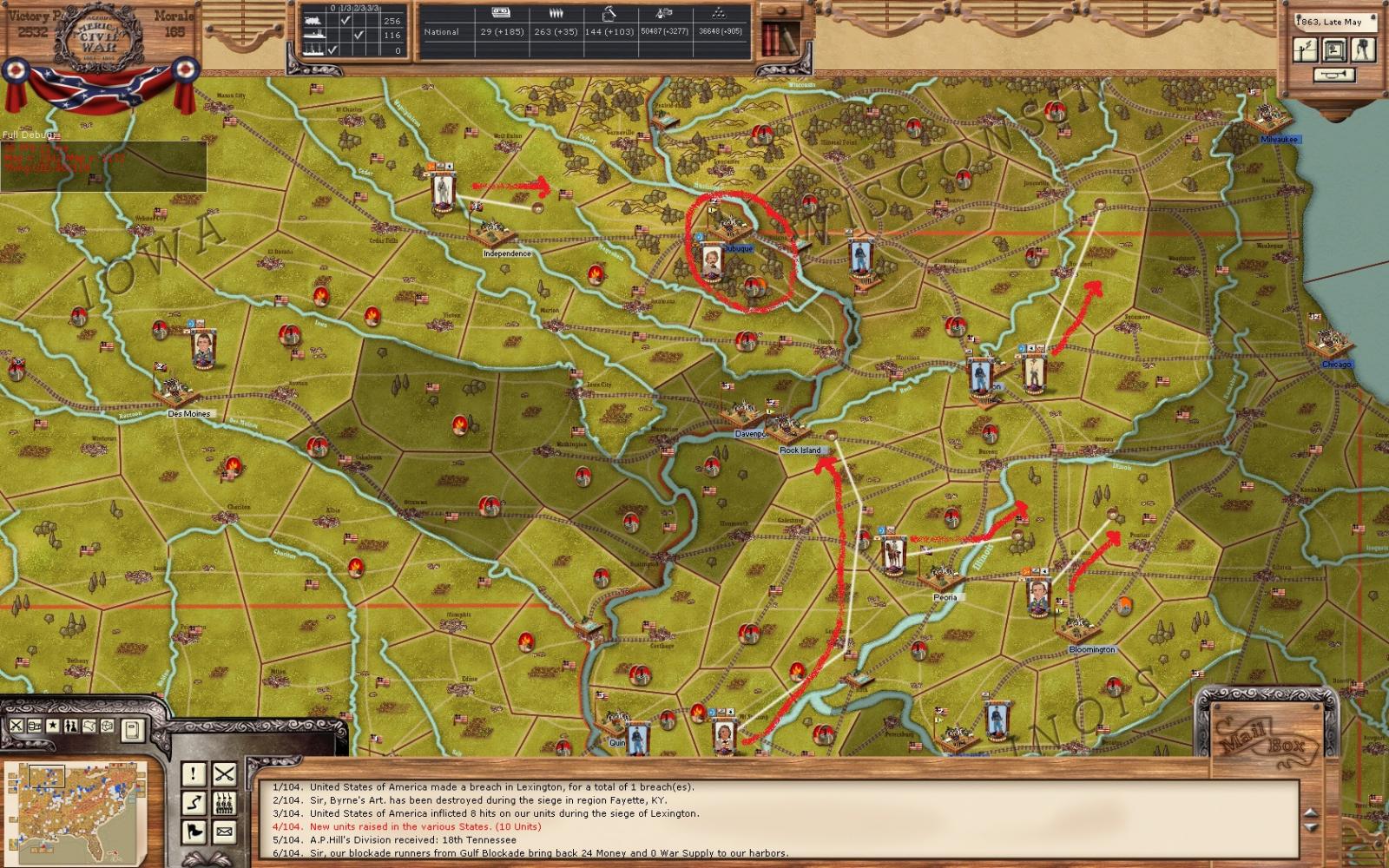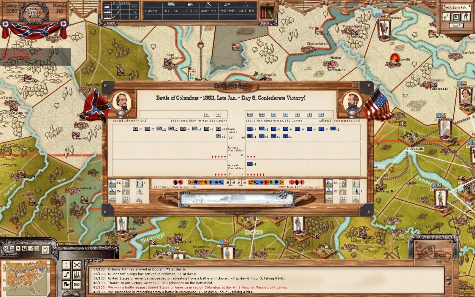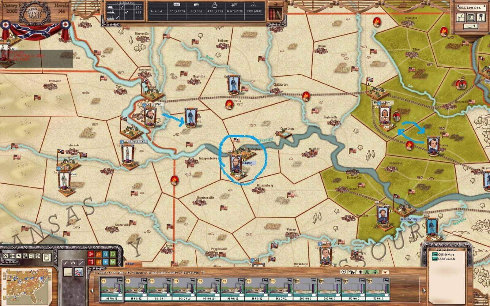 regarding your attack on Cairo, don't you fear that this will risk getting some of your forces stranded on the north side of the river if his boats prevent you from crossing back ? In that case you will lose troops in the same way he lost some... I would put the priority on stabilising that front and then either try to push him back accross the Ohio in Kentucky or Go for a big gambit an try to take St Louis an break his back in the transmississippi theater.. Anyway things are going really great...