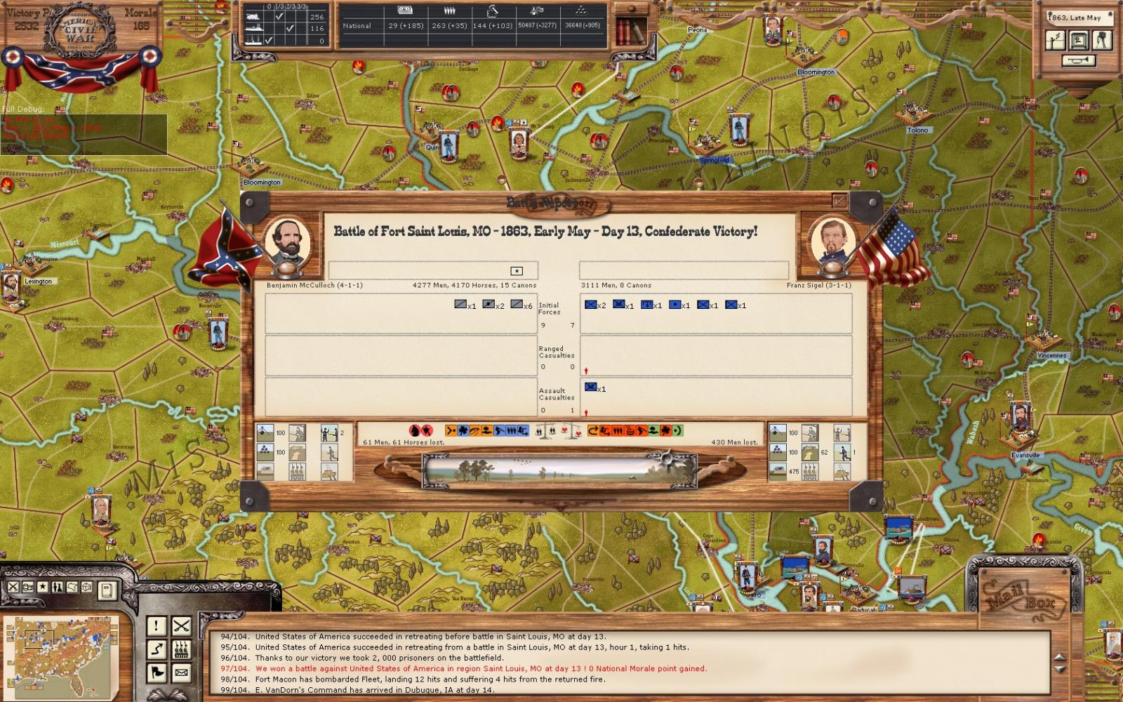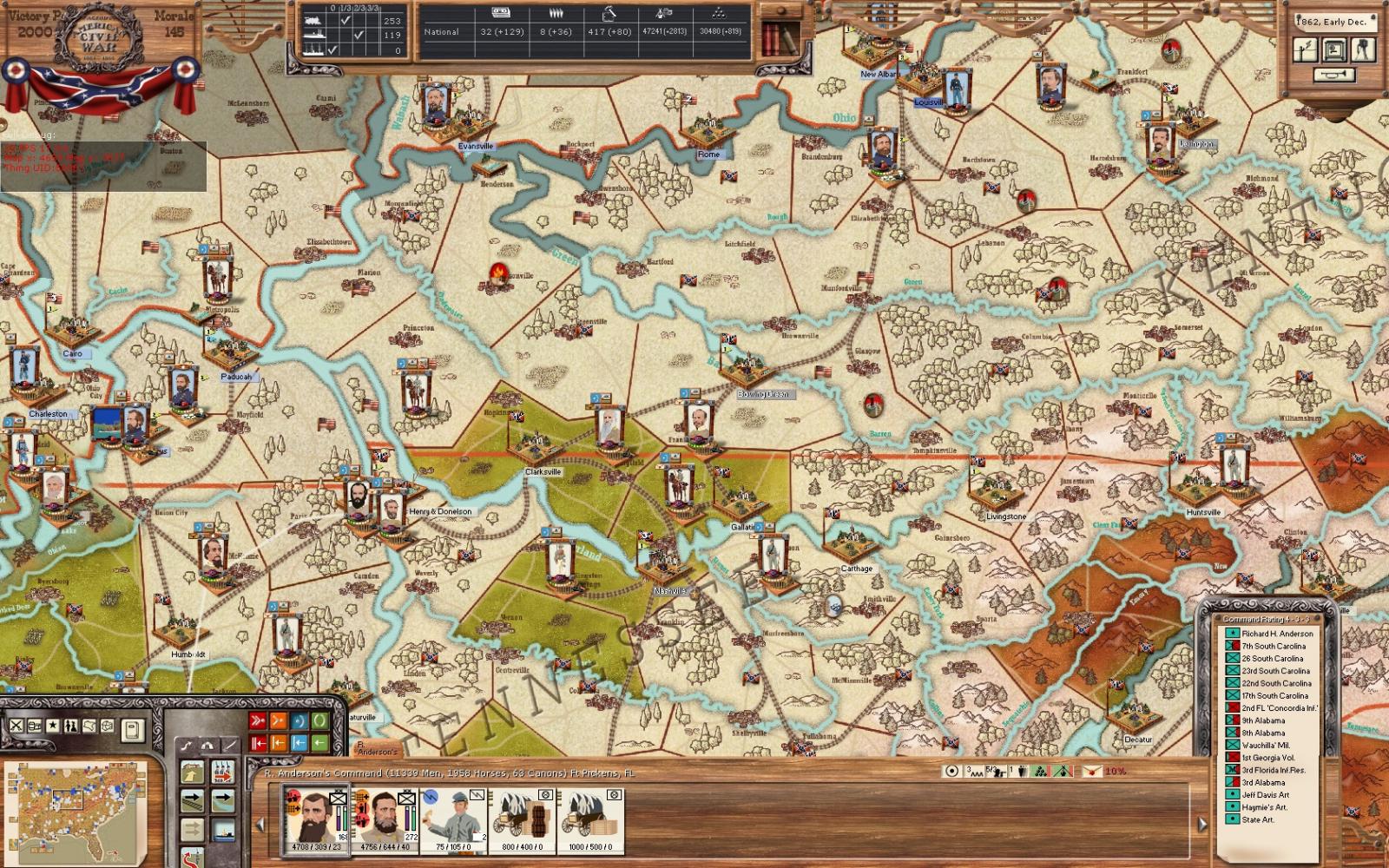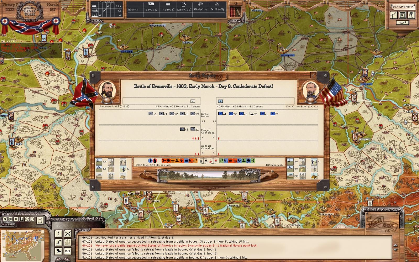 regarding your attack on Cairo, don't you fear that this will risk getting some of your forces stranded on the north side of the river if his boats prevent you from crossing back ? In that case you will lose troops in the same way he lost some... I would put the priority on stabilising that front and then either try to push him back accross the Ohio in Kentucky or Go for a big gambit an try to take St Louis an break his back in the transmississippi theater.. Anyway things are going really great...