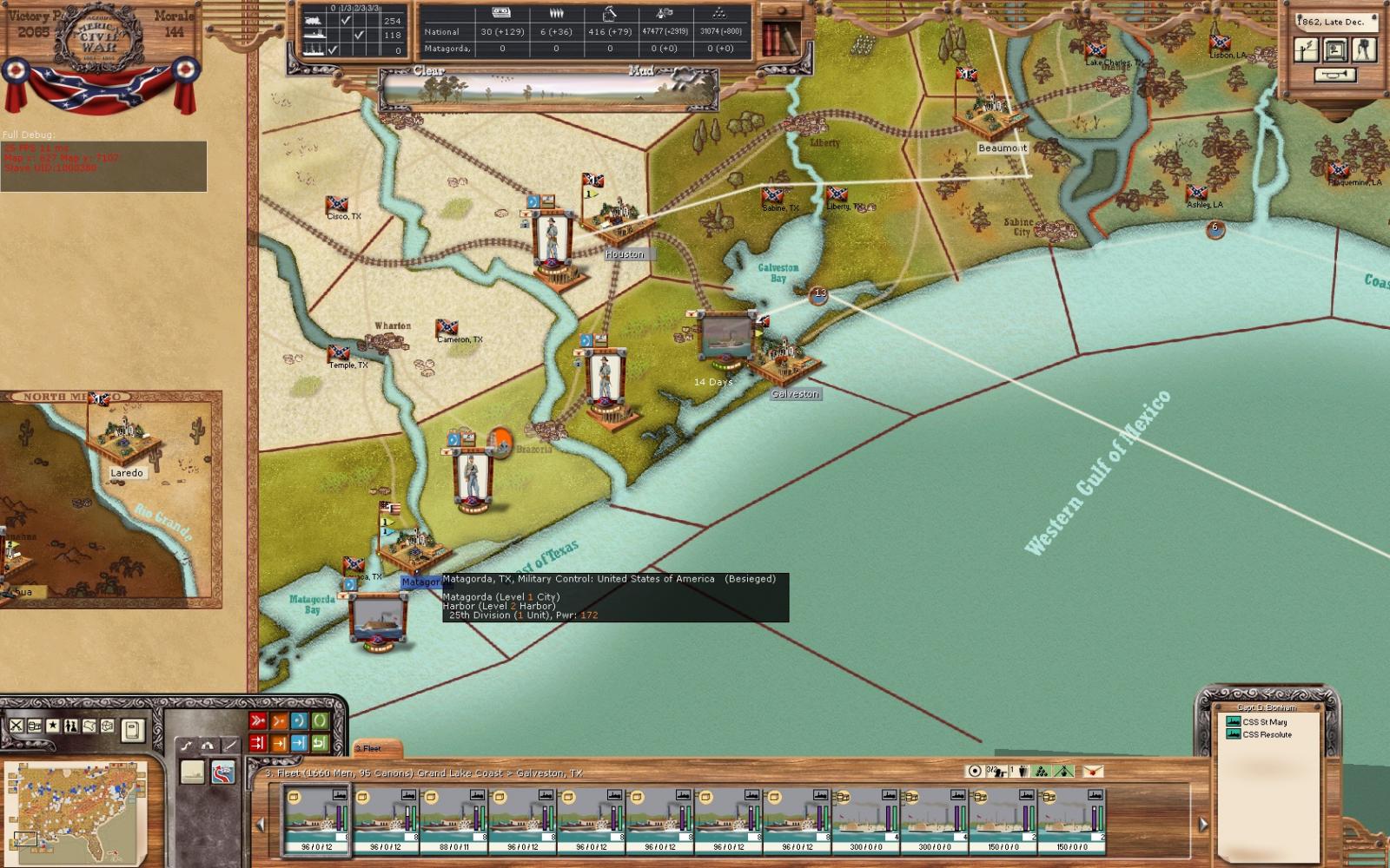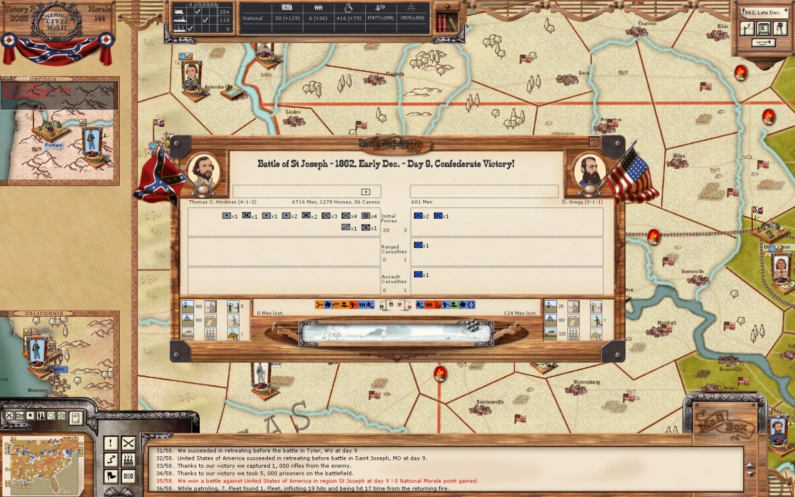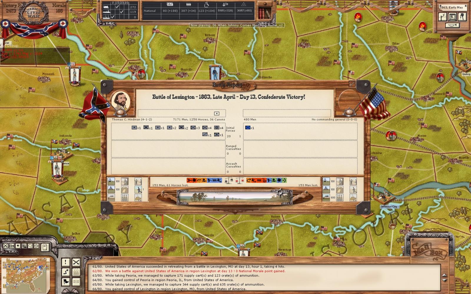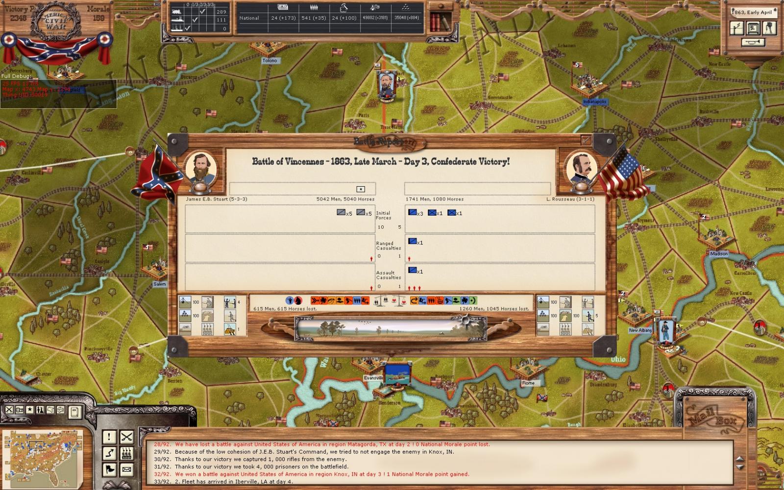 regarding your attack on Cairo, don't you fear that this will risk getting some of your forces stranded on the north side of the river if his boats prevent you from crossing back ? In that case you will lose troops in the same way he lost some... I would put the priority on stabilising that front and then either try to push him back accross the Ohio in Kentucky or Go for a big gambit an try to take St Louis an break his back in the transmississippi theater.. Anyway things are going really great...