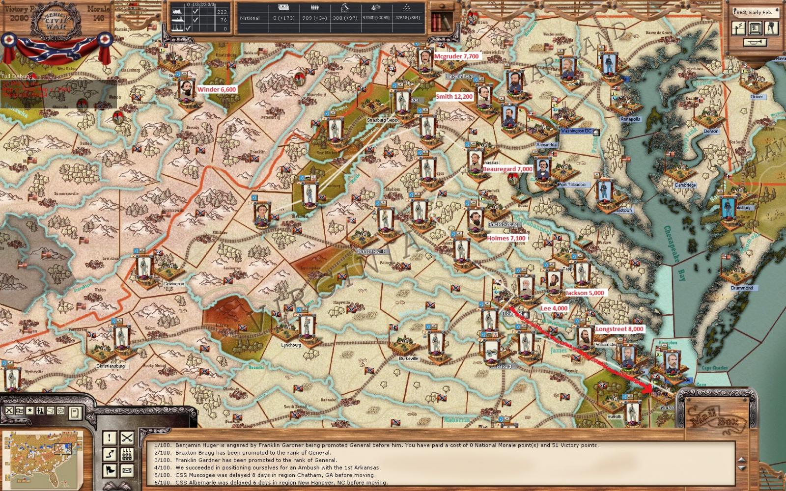 This western Kentucky campaign is the highlight of the war so far. Funny how Virginia is a peripheral theater in this game. It is a mistake from him not to put pressure on you there, as it allows you to have enough forces in the west were there is more territory to cover and he should be able to ountmanouver you, as well as in the gulf where you have been able to react to his invasions.. Had you been under sustained assault in Virginia you would have 4 or 5 divs more overthere rather than available somewhere else...