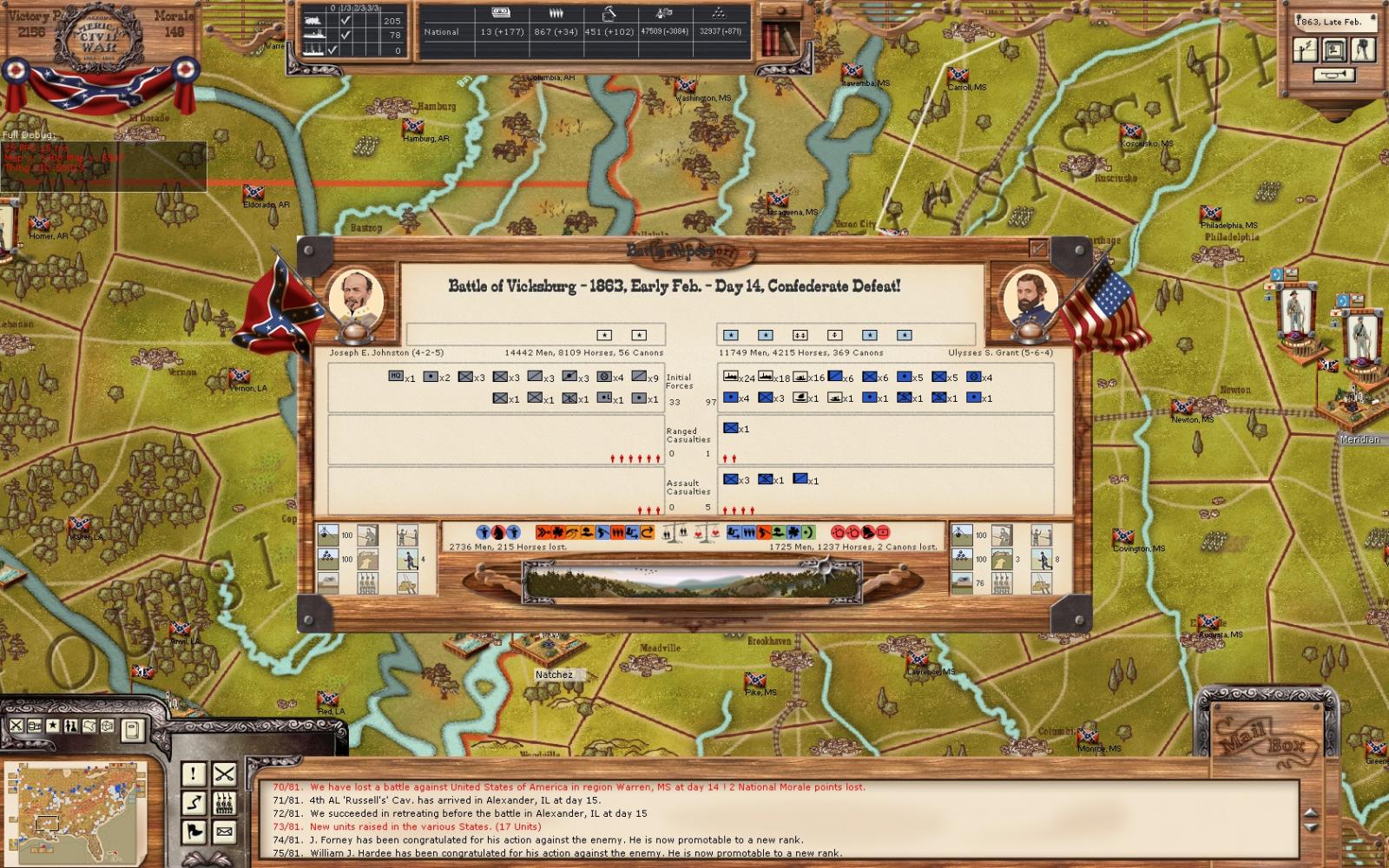 Wow... This means that you just destroyed (with the battle losses added) something like 45 to 50 000 troops in a month of campaigning ! His position in the west is completely unhinged. If his adventure in Vicksburg goes sour as well, this is a calamity for him. unbelievable...