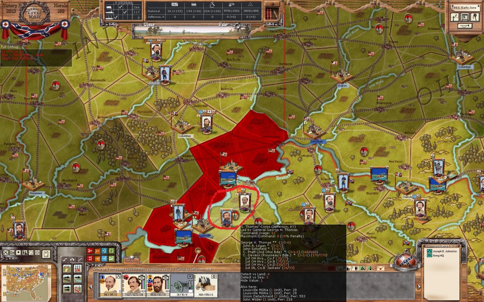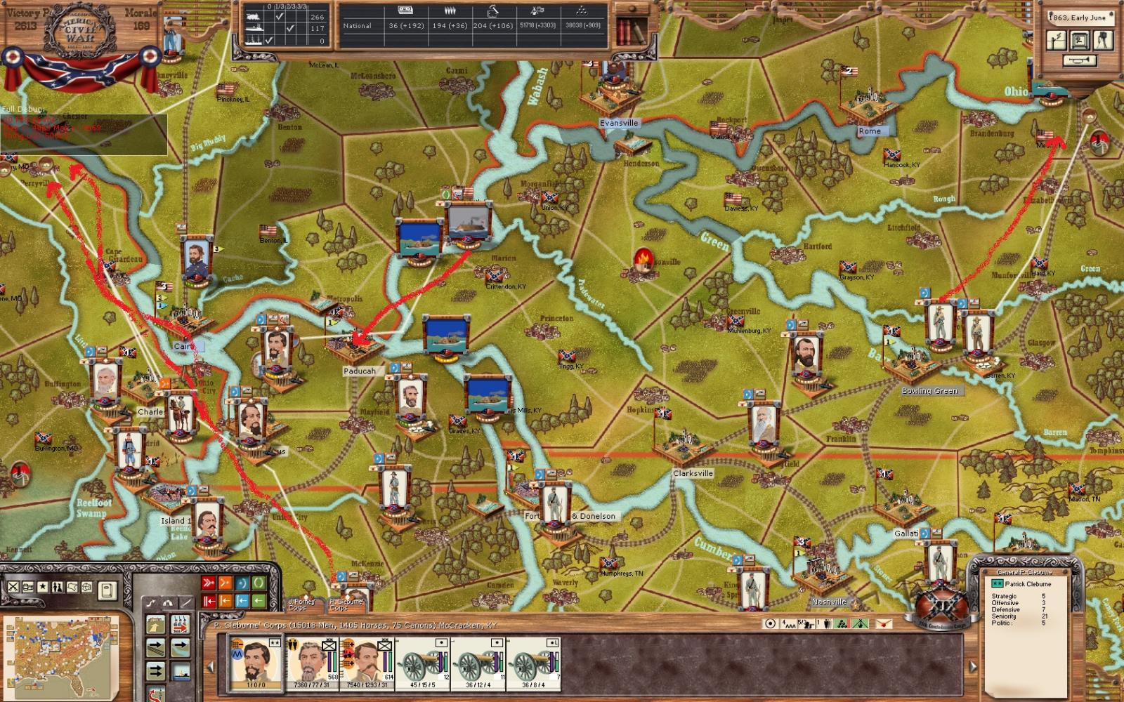 I'm sending cavalry forces in to the areas around St. Louis to keep up the pressure there. Still hoping I see an opportunity to get Jefferson City. A three element brigade will move to repair the rail in the region South of Louisville, KY. I want to be able to bring some more forces into the area quick and think I can spare a division or two from the Western Kentucky area soon. Time to get Buchannan's naval force back to the safe harbors of Paducah.