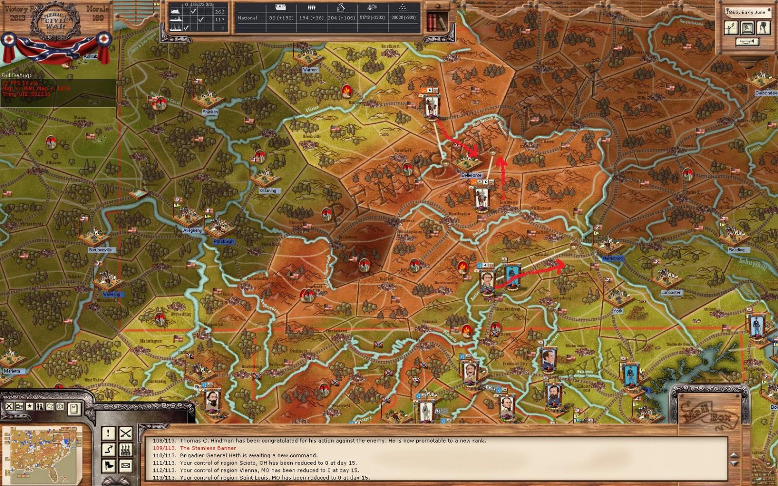 The depot in Iowa should fall this turn and Van Dorn will have all the supply he needs. Hindman holds his position and I know that the enemy forces West of him are going to be out of supply. I'm sending a 3 element brigade to take St. Josephs, MO. Other than that just a lot of raiding.