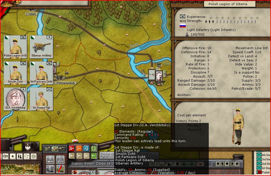 No more units for Siberian Whites that can fight Ural, Volga, Central Russia and other regions without been heavily penalized? :( After first RUS patch only cavalry and infantry conscripts don't have "regional" ability, that prevent them to fight outside there regions. And I cant combine this infantry to one division or corp with any artillery battery or armor car - this ability applies to all elements of the unit.