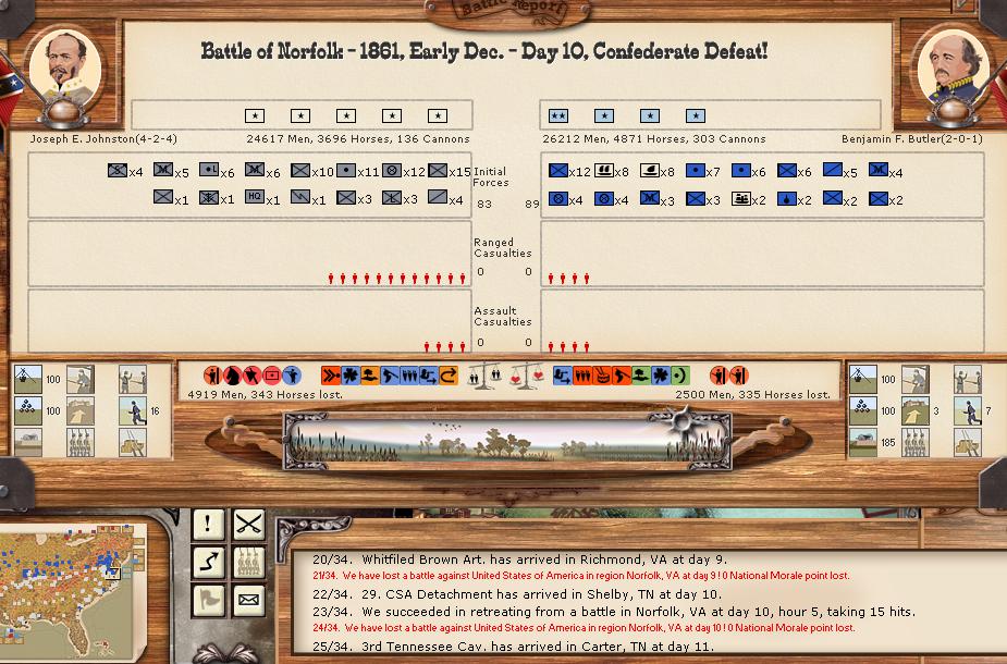 There were 2 major and 1 minor battles this turn. Both major battles occurred in Norfolk VA. As a result, the confederates lost approximately 12,000 men (including the retreat hits). The union lost only 6,300 men. A very bloody 2 day battle, which the south can not afford for long. The confederates went from fewer casualties to almost even this turn.