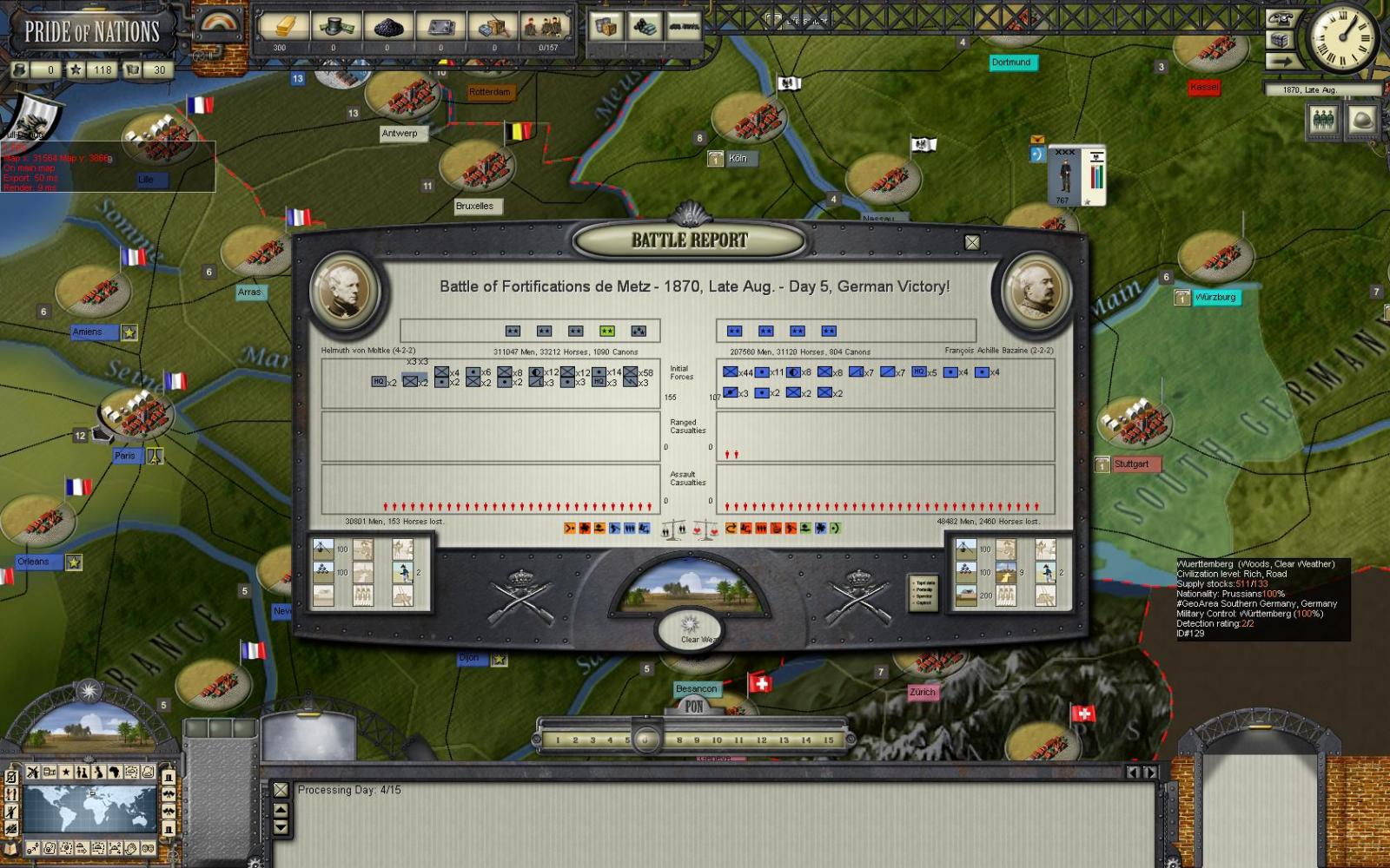Amazing – Wunderbar ! – the French made a stand and fought everywhere – and they were duly crushed. Bazaine army, badly mauled by Von Moltke, is back to strength inferior to 2000. Mac Macon army beaten in Alsace, retreated to Saar, where she was routed by Von der Thann, and routed again by Friedrich-Karl. Und post vernichtet ! dasz ist die groszte Preussige Sieg since Waterloo. Hurrah fur der König ! Nach Paris !
