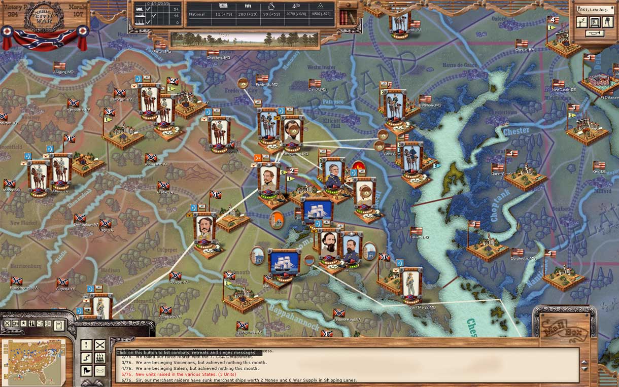 anyway, the rebs are making a full run at DC. every rebel unit in range is ordered to the region. again, if we're able to push the usa army out of the region, we might be able to pull this off. whatever happens, i'm having fun playing the rebs this way. it's definitely possible to keep even a large USA army on their heels. Stonewall had the right idea. in this game i've been able to knock on his doorstep when that was the only thing he had to defend against. i'll be amazed if i can pull it off...