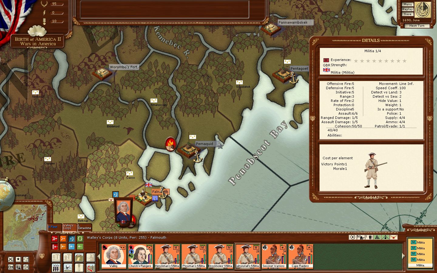 To the east Pentagouet surrenders to Wally's troops but his overconfidence left the recently re-captured Pemaquid lightly defended.