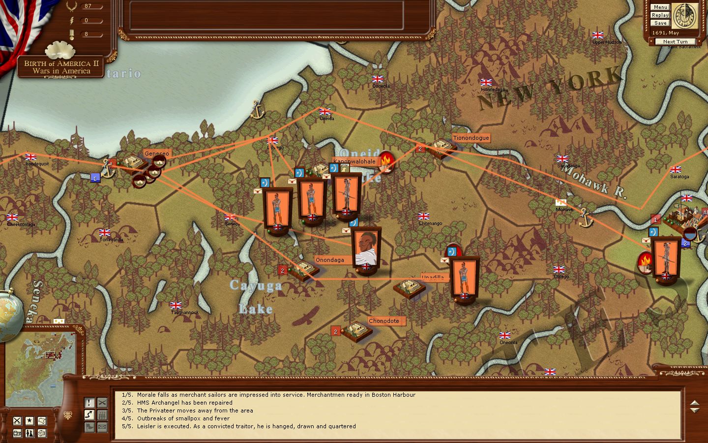 A privateer spots Frontenac making an early return to New France. This should prevent the French from abandoning fort Frontenac due to the difficulty of maintaining such an isolated position. Historically Frontenac tried to stop the abandonment when he arrived but was too late after his return to New France was slowed by storms. I should mention that we have not chosen the ahistorical option for this AAR which can result in fairly major changes - but small differences like this can occur randomly in the scenario to ensure replayability.
