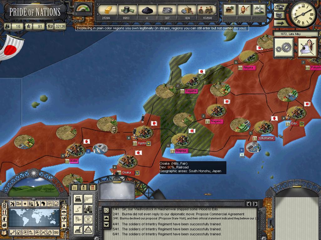 When Boshin War came, thee regions (toyama, nagoya, hokaido) change ownership to REB by event. It may not look that bad, but on recapture they convert to permanent colonial provinces (maybe REB unciv nation). Your country will be effectively split in half (by toyama, nagoya) and second half disconnected from capital by "colonies" loose national territory status (became only claimed), you loose 1/3 of consumer market.