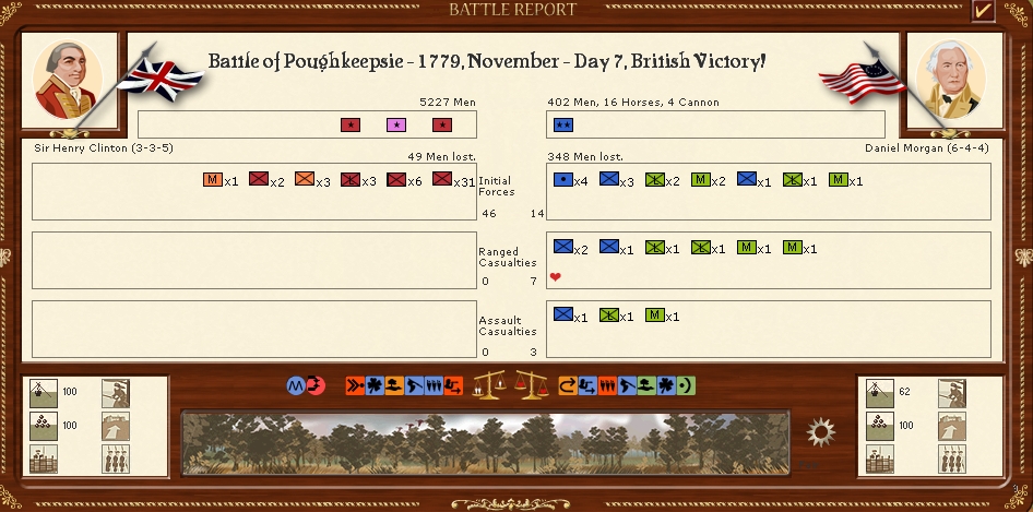 The Comander in Chief Clinton engages the rebel Daniel Morgan and his army near Fiskill inflicting a serious defeat on the rebels who disappeared into the wilderness Clinton will march back to New York to take up winter quarters next month.
