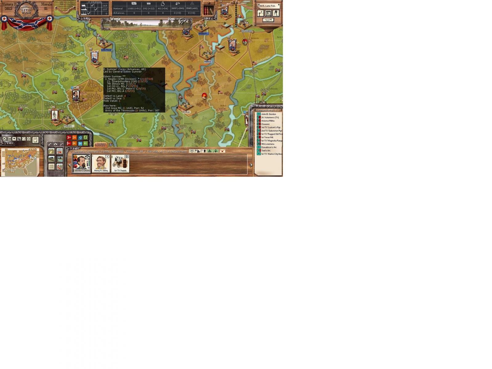 There was a little action in Missouri. My Indian unit destroyed the RR and moved to Union. The Union took back Bloomington. This clearly show the Union isn’t going to give me a free pass in this far flung theatre. Furthermore, General Crittenden with a brigade, militia, and 2 batteries has showed up across the river near Bloomington. I can only imagine they are coming to Jefferson City. On one hand, I could raise a militia unit and battery in Jefferson City, but I’m hesitant to put resources into a region which I can’t really believe is going to help me hold off the union. Jefferson City only provides +4 in GS and I can’t industrialise in the state. This leads me to believe that putting non cavalry units in there would lead to them starving, even if I could hold off the Union. This turn the Indian unit will destroy the RR and head back to Jefferson City. I’m also sending 1 more general to Jefferson City to bring a full complement of 4 generals there.