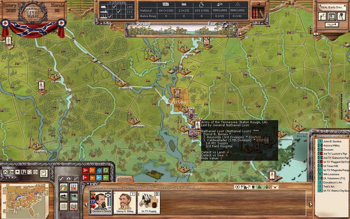 As I predicted Lyon’s force of 2 division moved into Baton Rouge and the decent amount of supplies, about 100 GS, in that city. Baton Rouge doesn’t have a depot, but since it is a level three city and a level 4 harbour, it holds more supply than a small town would, naturally. Lyon’s force may be in a tricky situation. Firstly, they are out of supply or nearly out of supply. Note the red dots on Lyon’s force. Yes the 100 GS will help, but I the city won’t make enough supply to maintain 2 divisions and the Union currently has no way to get supply down without running the guns of the Mississippi. Furthermore, it is nearly winter and river movement is about to slow down a lot. Secondly, the low power values of 50 and 37 show low cohesion as the men are exhausted after the long campaign from Missouri, yes Missouri. I’m sending Gordon’s division to take up a position in Port Hudson via river movement. The Baton Rouge militia will evacuate to the New Orleans fleet. I’m setting the New Orleans fleet to bombard, sort of curious to see what a small fleet can do against a very tired army. One final point, New Orleans generates 177 GS per turn.