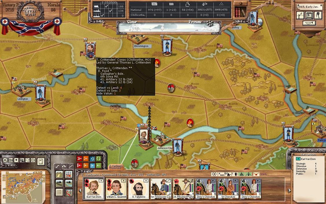 There was a little action in Missouri. My Indian unit destroyed the RR and moved to Union. The Union took back Bloomington. This clearly show the Union isn’t going to give me a free pass in this far flung theatre. Furthermore, General Crittenden with a brigade, militia, and 2 batteries has showed up across the river near Bloomington. I can only imagine they are coming to Jefferson City. On one hand, I could raise a militia unit and battery in Jefferson City, but I’m hesitant to put resources into a region which I can’t really believe is going to help me hold off the union. Jefferson City only provides +4 in GS and I can’t industrialise in the state. This leads me to believe that putting non cavalry units in there would lead to them starving, even if I could hold off the Union. This turn the Indian unit will destroy the RR and head back to Jefferson City. I’m also sending 1 more general to Jefferson City to bring a full complement of 4 generals there.