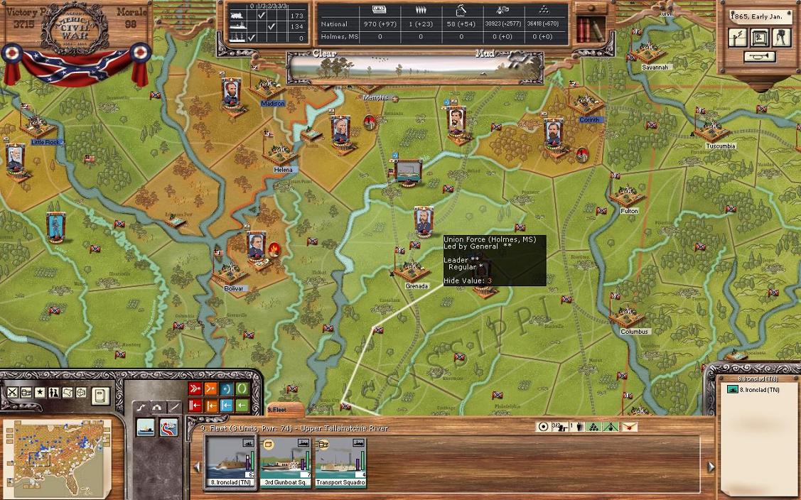 Kershaw’s division took up a defensive position in Marshal Mississippi unmolested. Both cavalry units made it to Watie’s division in Grenada. The Union sent a division to take back Helena Arkansas. My Mississippi fleet arrived in Vicksburg. I’m sending a small fleet (1 ironclad, 1 gunboat, and 1 transport) to the Upper Tallahatchie River to block the RR bridge there that heads to Grenada. This will help to isolate the Union force of McPherson’s Corps in Corinth.