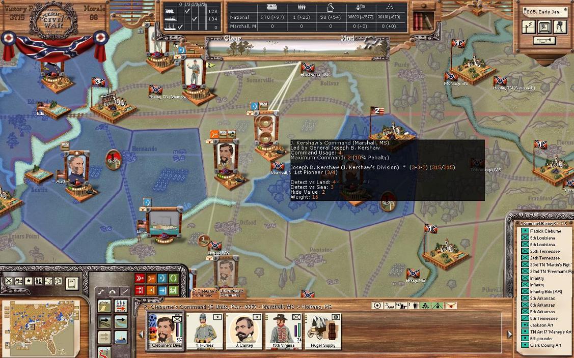 Watie won a victory in Greneda against foster, this is a +1 NM victory. However, this means that Foster crossed my fleet in Upper Tallahatchie River. Does anyone know how I can know how many guns are required to stop enemy river crossings? I didn’t expect this battle, but Foster was really able to move fast. I’m going to attempt to catch up with the rear guard of Foster. Here is what is happening. I’m restructuring Cleburne’s Division into a really strong force and will leave Kershaw with the engineer in Marshall to continue digging in. Cleburne will go to via the RR with a conservative attack. To ensure Kershaw isn’t too weak, I’m sending a signal unit from Memphis, a cavalry and columbiad unit from Gardner in Dyer, and a militia unit from Magruder in Henry. Watie’s division meanwhile will still hold Grenada.