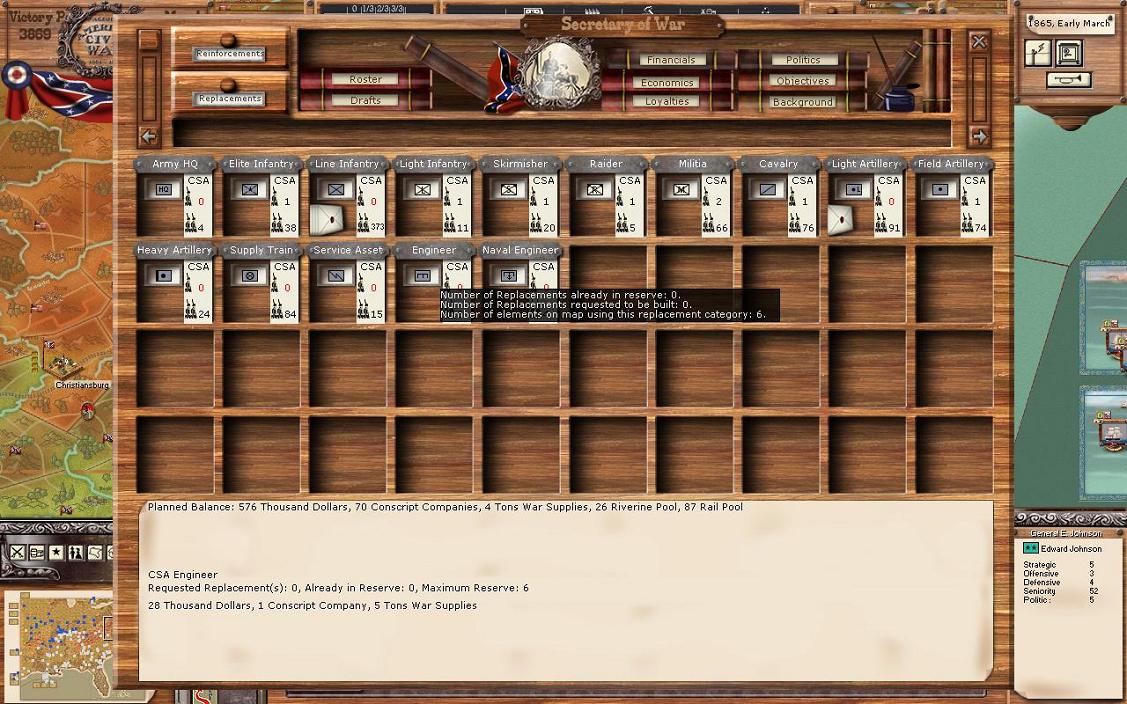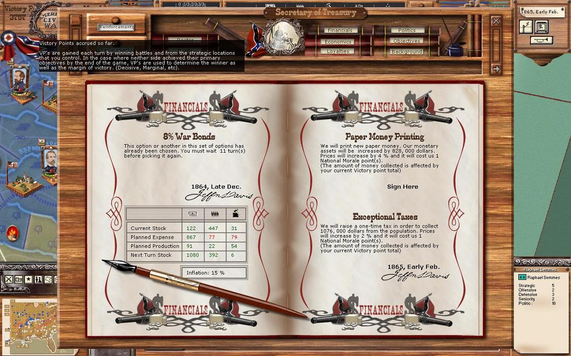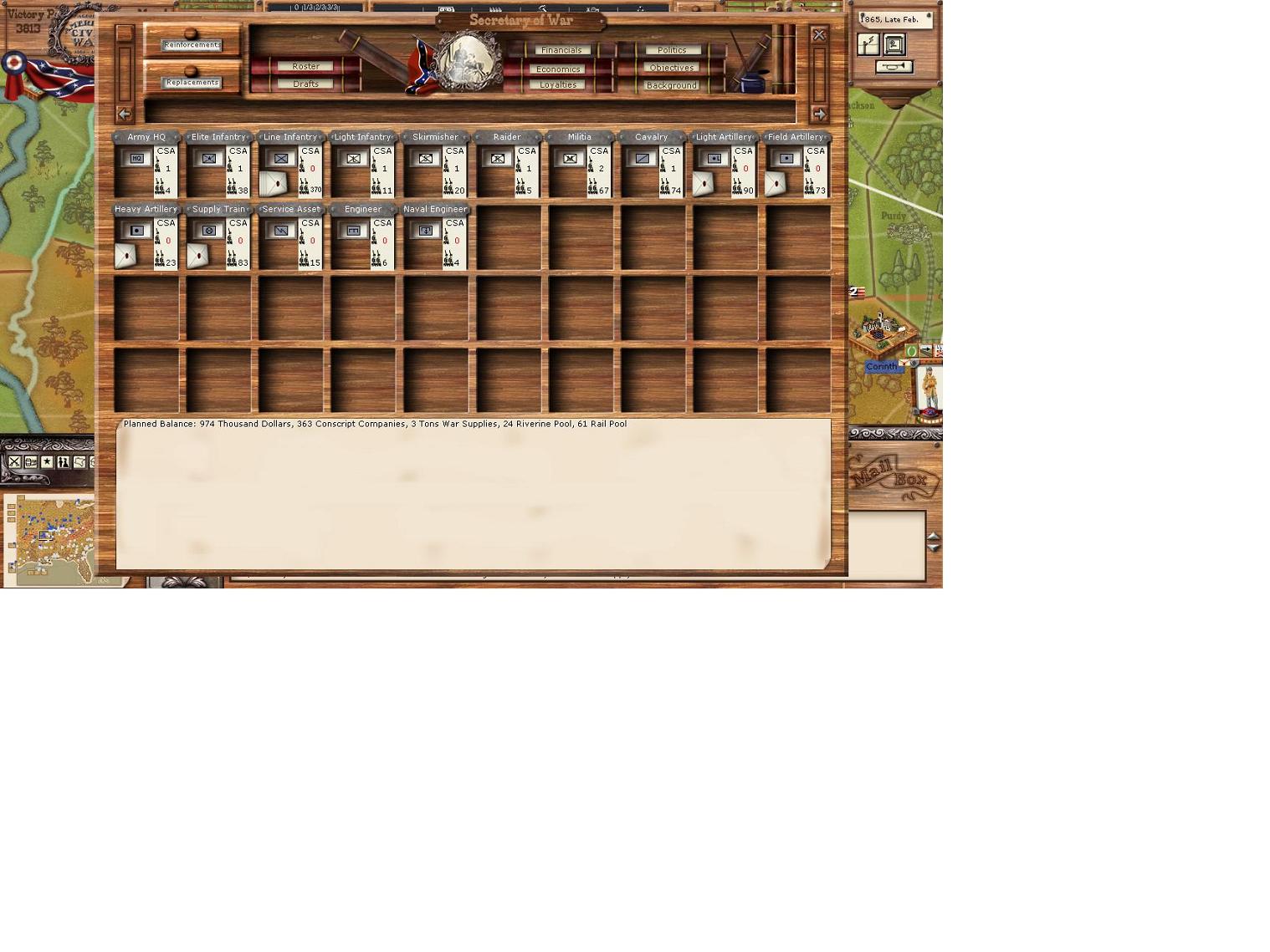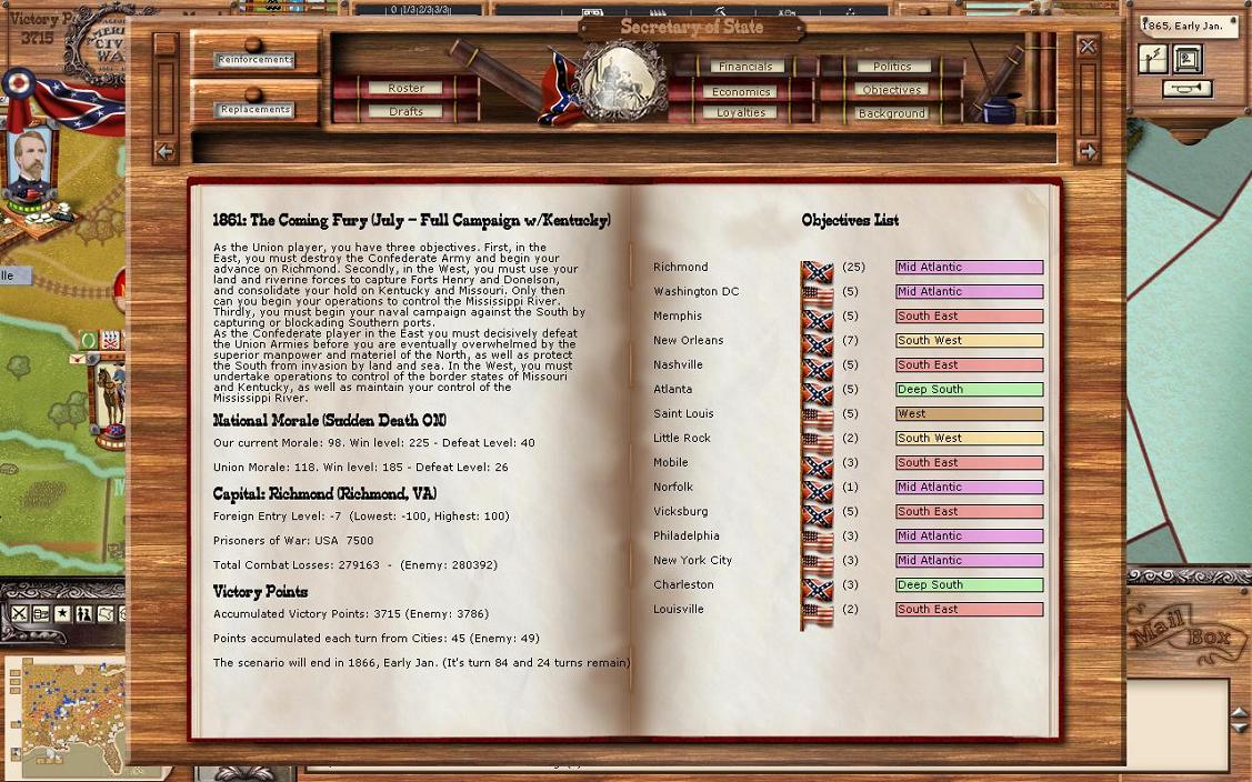 Hehe. No worries, I know the CSA position is a hard one, and when I asked for the overall plan, I did not necessarily mean one for 'winning' the game. I do agree that, really, if the CSA manages to stay largely intact into 1865/66 (when does the game actually end?) it could be considered a victory.