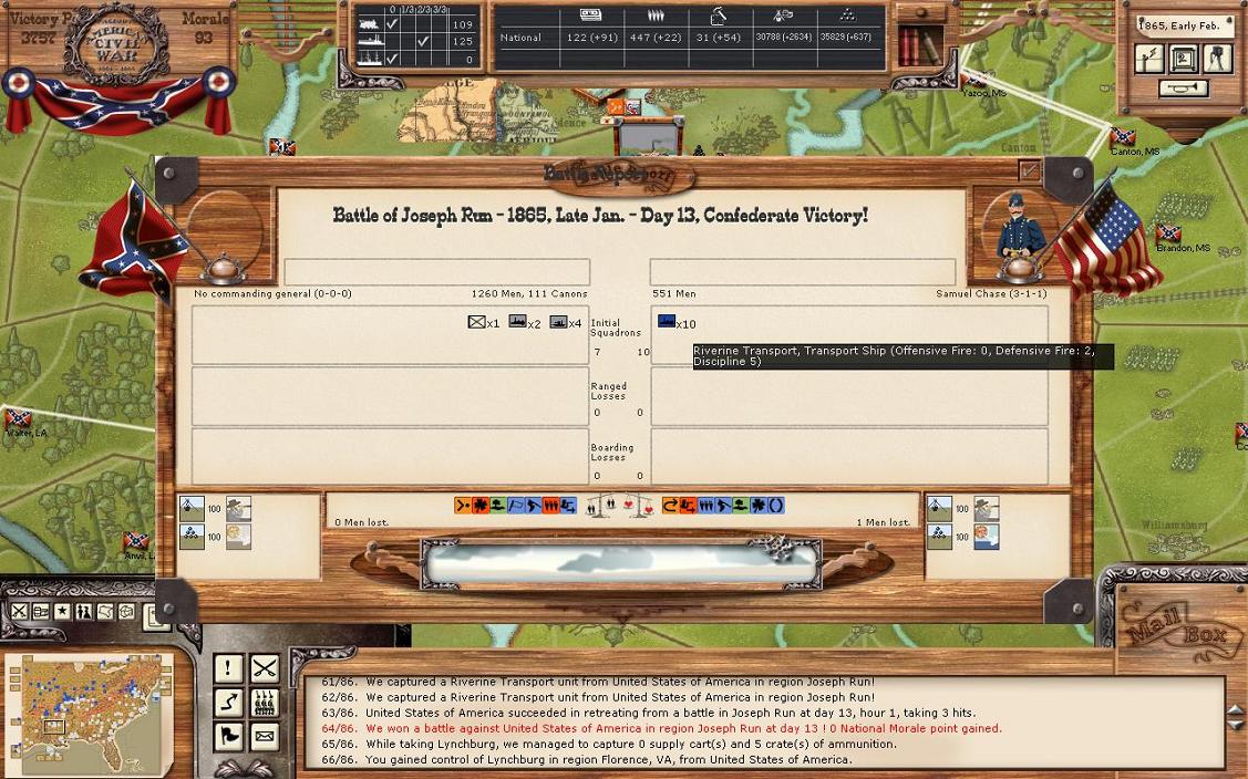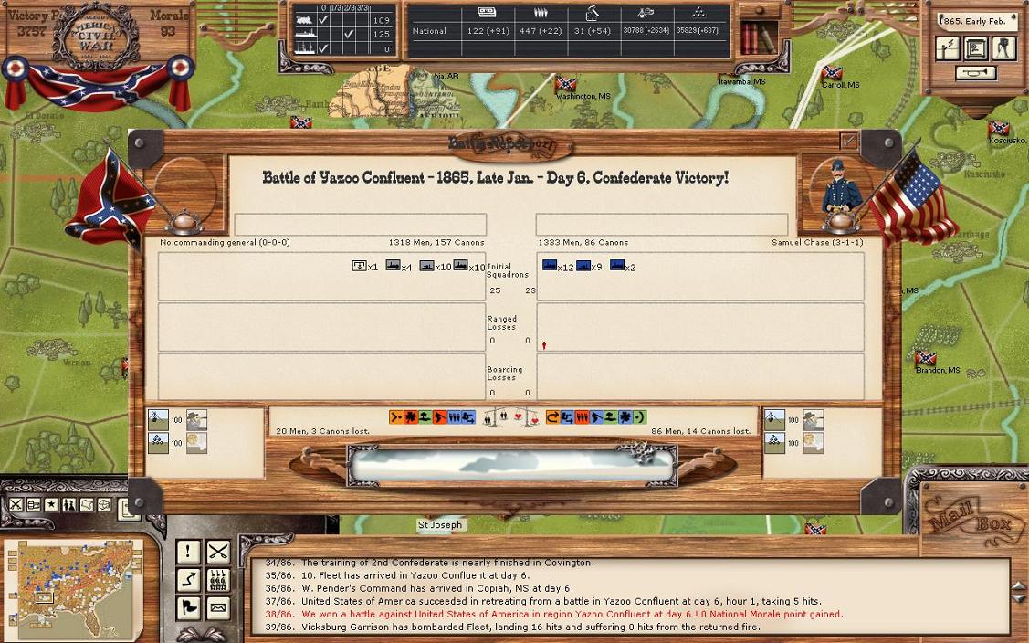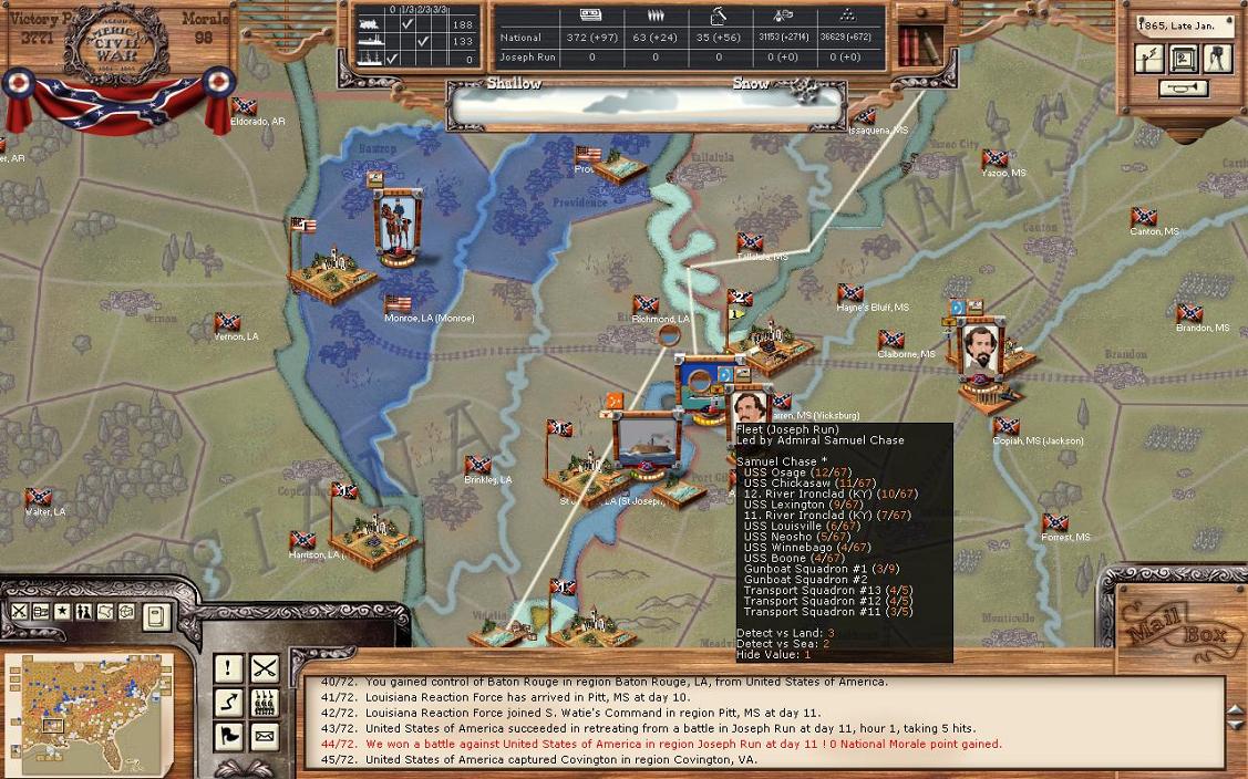 Next to Port Hudson there was a naval engagement on the mighty Mississippi River. This was a CSA victory; however, my Admiral was killed! Admiral Buchannan has been killed. Talk about an unlucky shot. This is a big loss as the CSA only had 2 admirals, and now there is 1. I really think it is unfair that the CSA has only 2 admirals. I believe there are 3 in the beginning, but then 1 sort of disappears as part of the game (presumed taken out of the game based on history). The battle screen doesn’t show him as killed, but the message box does and he certainly isn’t in the fleet anymore. The Union fleet now has power of 250. I’m going to target the Union fleet with my New Orleans fleet (power 315) and leave the Mississippi fleet where it is (power 416). Both fleets are on conservative attack. I hope that the Mississippi fleet will attack first and by then the New Orleans fleet can come in and hit the Union fleet again. Gordon’s division will also go to Baton Rouge to retake the city. Okay, I’m sending a cavalry unit that was created in NO to react to a raid and the NO supply unit to Waite in Grenada. I’m also sending General Zollicoffer with a now unlocked NO militia unit and a depleted fort battery to Jackson. I want the force in Jackson to start digging in beyond level 4 and artillery is needed for that.