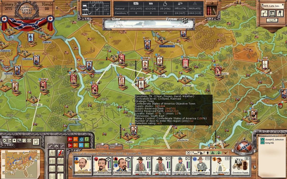 Industrialization paid off as Memphis built a +19 GS. Beauregard has raised the defensive values of corps commanders to between 2 and 4. The newly appointed corps commander Bernard Bee has arrived in Overton and has taken over command from John Walker. I now have MTSG across 7 regions from Humboldt to Overton. Pulaski and Nashville have been reinforced with a few militia units (note that these units have been mostly trained by now). My militia unit took control of Huntsville. There was no Union movement that I saw in this region. The supply situation is still precarious; Nashville has GS of 35 / 1174.