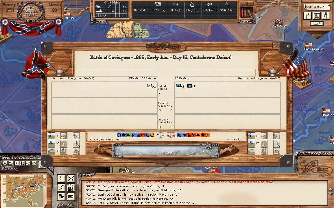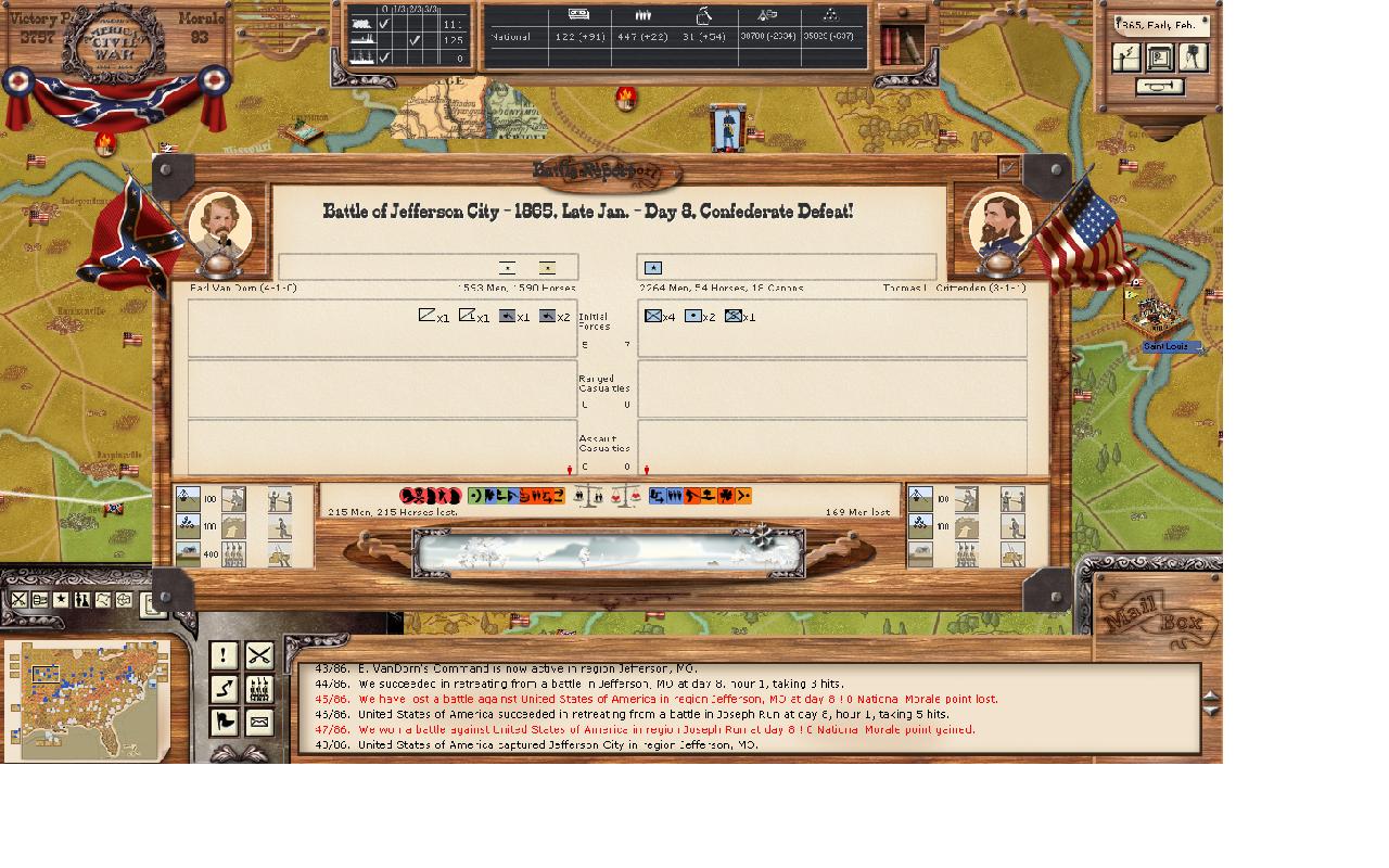 There was only 1 battle this turn and it was a skirmish at that. My sharpshooter and militia unit ran into the Union cavalry in Richmond LA. There was a small skirmish and the Union withdrew. I’ll now split my 2 units to rebuild RRs that the Union destroyed.