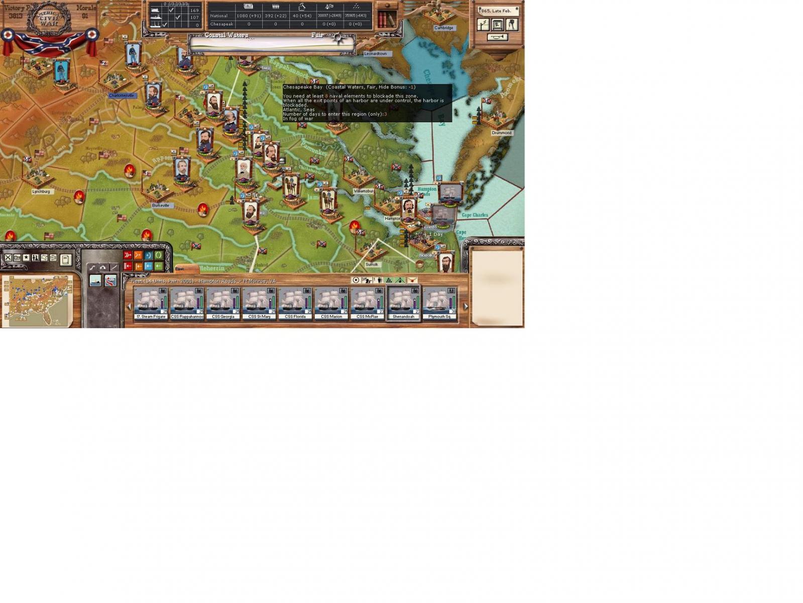 Richmond built a +2 WS. The AoNV is pretty much at full strength with 75,000 men. For the CSA, my intention is to build a division in Norfolk led by General Wilcox. A full brigade has finished in Wilmington is on the way along with an additional artillery battery and small brigade from FL (rerouted from Anderson). I don’t have the forces to hold Ft. Monroe though. As I mentioned in the GA/SC section, a large Union Army has left Manassas and passed through Alexandria. The Union now doesn’t have the forces to take Richmond. Therefore, I’m going to send Edward Johnson’s corps to Goldsboro NC. From this location he can move to counter any Union threat ranging from Norfolk to Savannah. My fleet will also go to Hampton Roads on conservative attack. It’s now up to the Union to make a move.