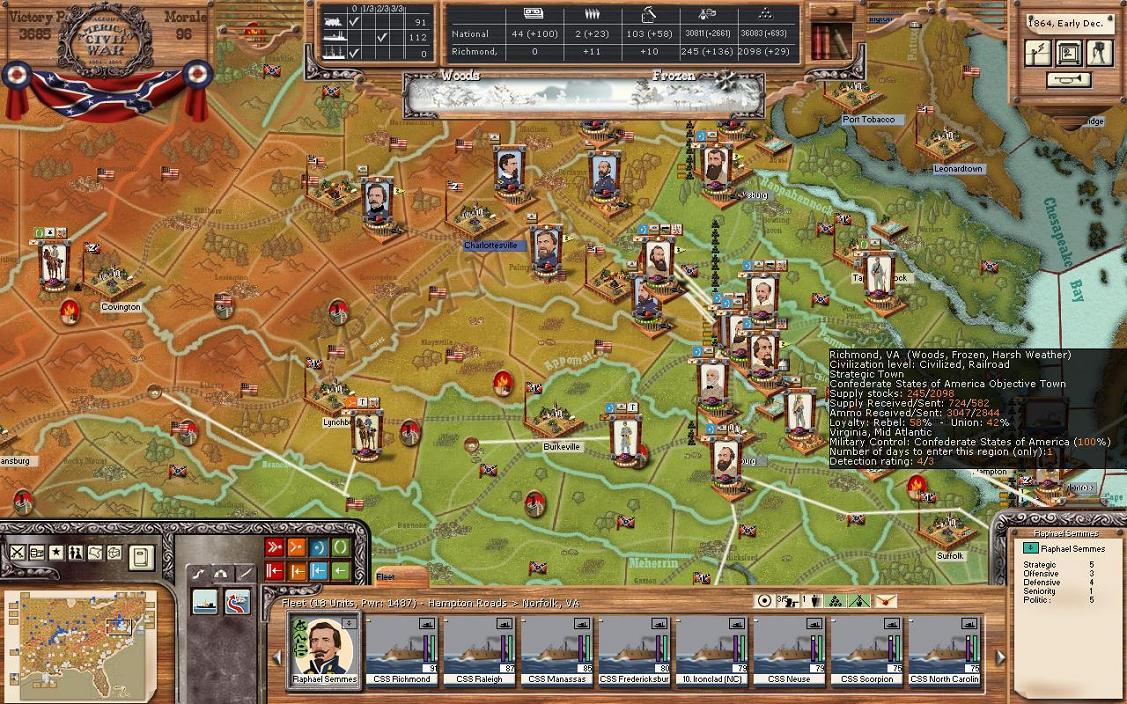 Now, what to do! I’ve made the decision to reopen the east west Virginia RR. Despite the temptation to set up a new supply line to NC, I think I would need 2 depots to do it, 1 in Garysburg and 1in Goldsboro. However, as I currently have no forces to defend the newly built depots, nor health supply units to build such supply units, that plan will be put on hold. Instead, opening the east west Virginia line is lower cost and may be done and held without support a couple turns to get the supply out of the western part of Virginia. Here is what will happen. The cavalry unit in Covington will destroy the RR there and rest as the unit has 0 cohesion, i.e exhausted. The RR is already destroyed to the east in Lexington VA, so I don’t think the Union will try to take back Covington this turn. The partisan unit in Lynchburg will rebuild the RR and head 2 regions west to Salem which has a destroyed RR. The RR NE of Lynchburg heading to the Union position is already destroyed, so I don’t think the Union can or will try to take back Lynchburg this turn. Trimble’s brigade will rebuild the RR in Burkeville and head 1 region west to Franklin which has a destroyed RR. Regarding other movements: 1. I’m also swapping division betweens Longstreet and Jackson/Johnson since Longstreet’s divisions have lots of hits and Jackson’s/Johnson’s divisions are at full health. Replacements primarily come in regions with depots. Meaning, the division will come to full strength faster in Richmond that in Longstreet in the field where there is no depot. 2. My fleet will head to Norfolk to meet up with the other small fleets that are there. 3. I’m also sending 1 transport ship from the Gulf to Norfolk. Once the fleets are combined in Norfolk, they will have 728 cannon. I could try to hold a naval defensive position in Hampton Roads at that point, something to think about. 4. My naval engineers in Richmond are also heading to Norfolk. 5. Joe Johnston in command of the empty army in Richmond will head to Gallatin TN. Joe Johnston now has stats of 4 / 3 / 5 which might even be enough to cause Grant some heartache. Finally, note that Richmond supply levels are at 245/2098.