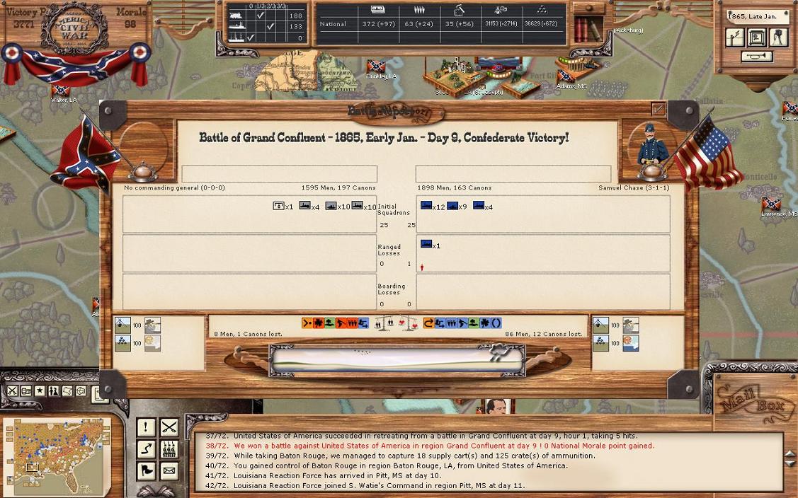Next to Port Hudson there was a naval engagement on the mighty Mississippi River. This was a CSA victory; however, my Admiral was killed! Admiral Buchannan has been killed. Talk about an unlucky shot. This is a big loss as the CSA only had 2 admirals, and now there is 1. I really think it is unfair that the CSA has only 2 admirals. I believe there are 3 in the beginning, but then 1 sort of disappears as part of the game (presumed taken out of the game based on history). The battle screen doesn’t show him as killed, but the message box does and he certainly isn’t in the fleet anymore. The Union fleet now has power of 250. I’m going to target the Union fleet with my New Orleans fleet (power 315) and leave the Mississippi fleet where it is (power 416). Both fleets are on conservative attack. I hope that the Mississippi fleet will attack first and by then the New Orleans fleet can come in and hit the Union fleet again. Gordon’s division will also go to Baton Rouge to retake the city. Okay, I’m sending a cavalry unit that was created in NO to react to a raid and the NO supply unit to Waite in Grenada. I’m also sending General Zollicoffer with a now unlocked NO militia unit and a depleted fort battery to Jackson. I want the force in Jackson to start digging in beyond level 4 and artillery is needed for that.