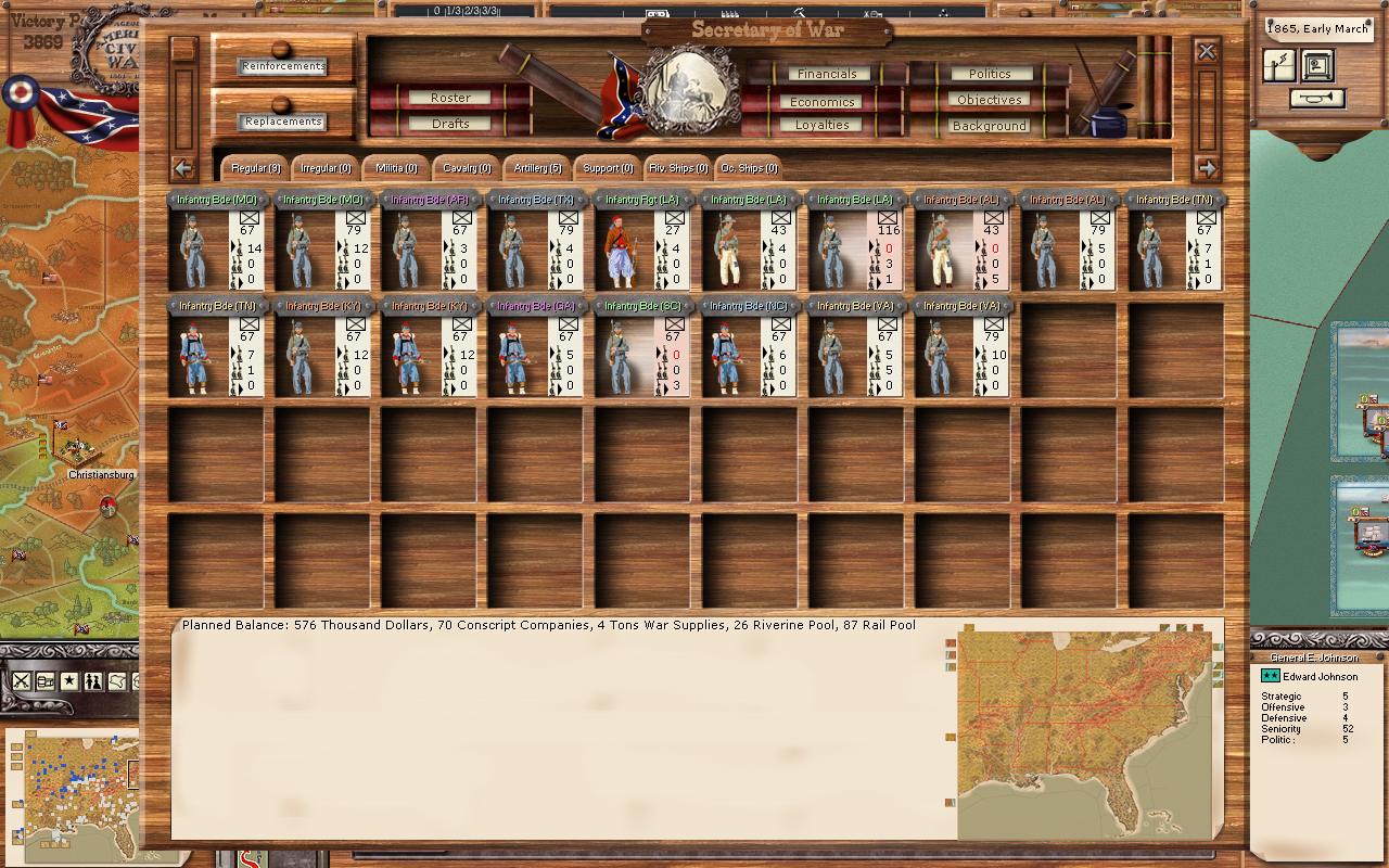 Hehe. No worries, I know the CSA position is a hard one, and when I asked for the overall plan, I did not necessarily mean one for 'winning' the game. I do agree that, really, if the CSA manages to stay largely intact into 1865/66 (when does the game actually end?) it could be considered a victory.