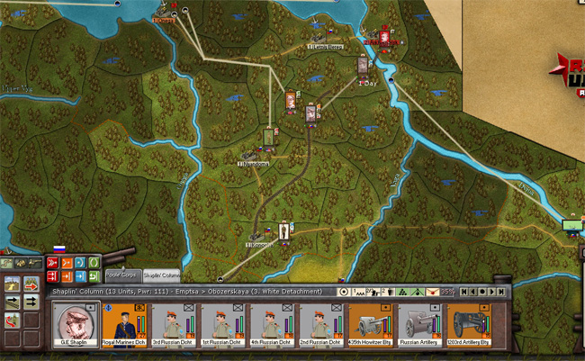 Late September, 1918: Shaplin's Column is safely evacuated to Murmansk. Good weather allows Drozdovsky's Corps to swing around Trotsky's flank and occupy the railway north of Balashov. Even with a river crossing further south to avoid potential penalties in battle, it takes only 9 days - 3 days per region - to manoeuvre an army of 500+ power, even with supply trains - talk about operational mobility!