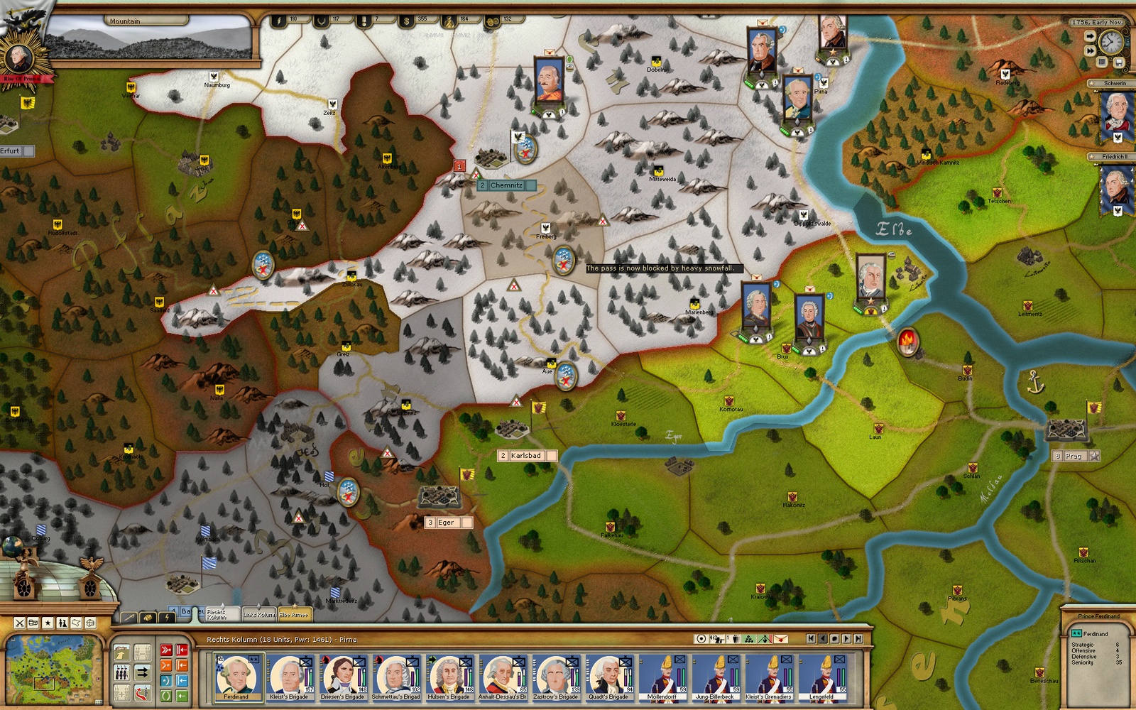 • The "Mountain Pass" is yet another link, to the regions which also report the blockage. (ex: Reichenberg to Gorlitz). This link actually gives some move bonus in Fair and Mud. allows passage in Snow, but blocks eveything in Harsher weather.