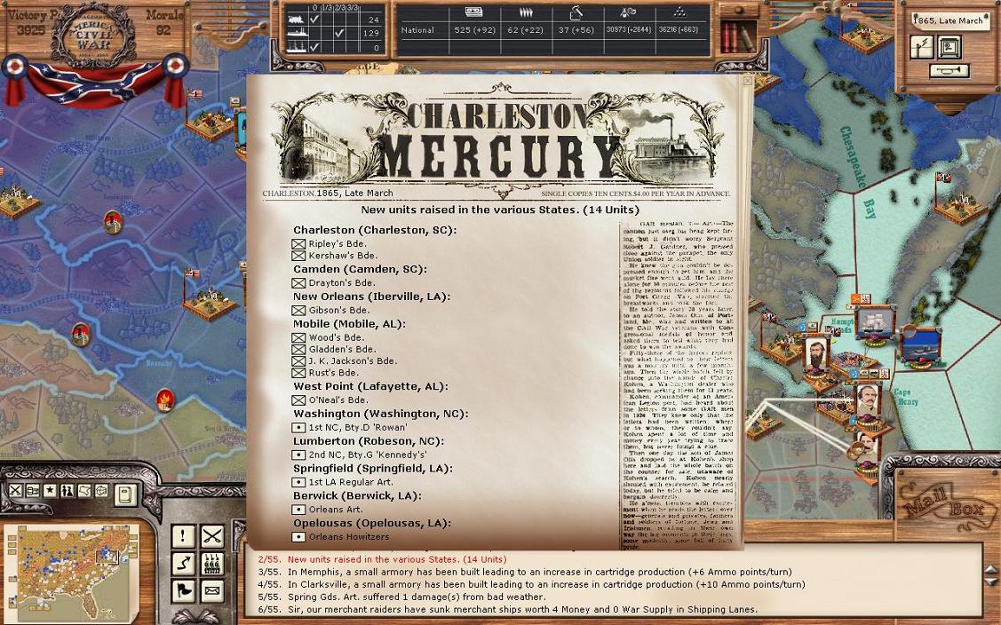 And here is the large Union fleet with an army off the coast of SC. There seems to be 2 three star generals and 2 two star generals along with many regulars and leaders. There is no detailed information though. I’m assuming as I’m sure you are that this is the army that left Manassas a turn ago unless it is a master ruse! What does this mean for the CSA? Well, it isn’t good, that is for sure. By clicking on the strategic icon, you and I can see there are many more strategic locations than I have forces to man. In particular, Wilmington and Savannah would be big losses. Why defend Charlestown? It’s an objective city, which means in game turns I would take a NM loss if I lose the town. It also produces money, CS, WS, and quite a lot of GS. For me to defend Charlestown, I think I will be able to field about 20,000 men. Edward Johnson’s corps will leave NC and head to Charlestown with 7,500 men. From what is in Charlestown including being built there is 5,000 men. Wheeler will provide another 5,000 men. Finally, there are a couple other brigades being built nearby. The Charlestown defences are already level 6. Since Charlestown generates 105 per turn and could feed this force indefinitely. What I can’t do though is defend Wilmington and Savannah without putting in danger another department. Furthermore, I only have 24 RR capacity left, which means I can’t move any other forces this turn. I did think about moving Hampton from Decatur TN, but alas, no more RR! Historically, the loss of Wilmington and Savannah were near death blows for the Confederacy. However, since I still hold Norfolk, the supply situation of the AoNV is rather different than it was historically.