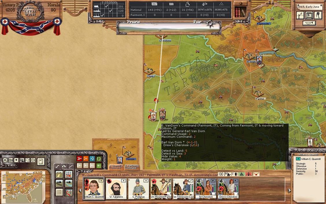 A CSA cavalry regiment from Houston made it Laredo and took control of the town for the CSA. The regiment is now on the way back to Houston. I’m sending 1 general from Galveston to New Orleans to up the command structure there. 1 general will leave Dallas and go to Galveston to replace the one that is off to New Orleans.