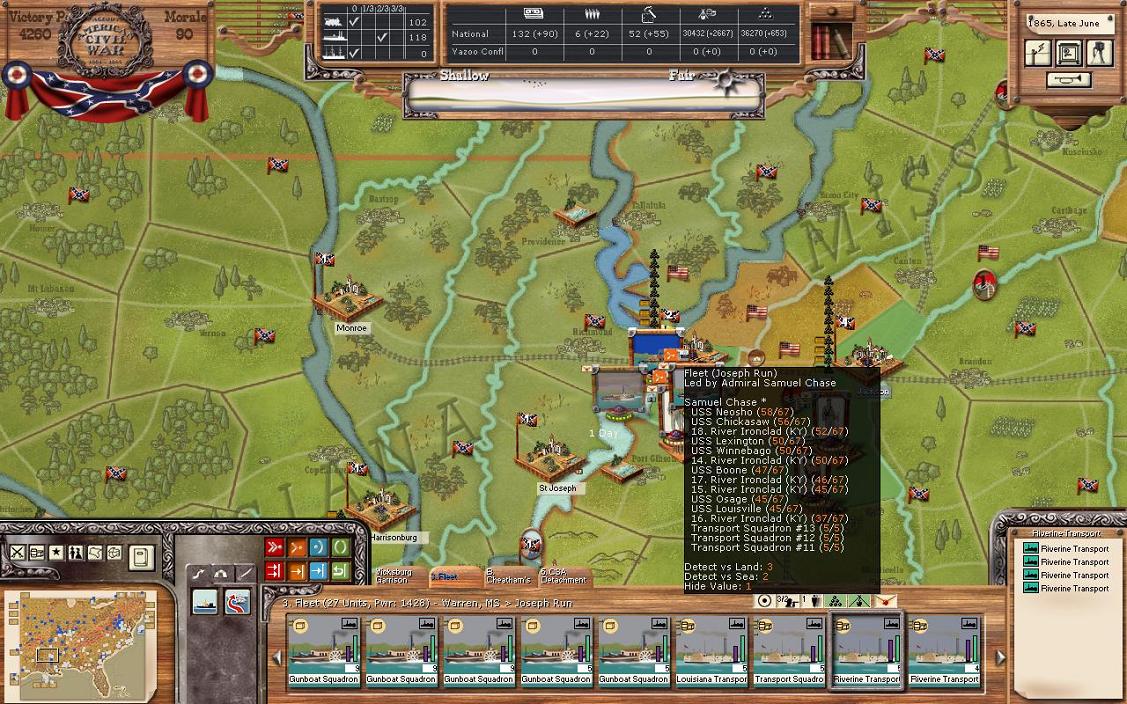On to Mississippi, there is quite a bit to talk about here, including the headline at the beginning of this post. First, I’ll get the easy items out of the way. My Sharpshooter unit fixed the RR in Monroe and will head back to Vicksburg. My militia unit took the harbour of Providence LA and will head back to Vicksburg. A lot has happened in this region with regards to Union movement. Clearly, Mortar wants to make something happen during the last year of the war. In a move that really shocked me, the Union has blown the depot in Corinth and evacuated the town. I confess, I really didn’t see that coming. There seems to be a general southern movement of Union forces away from the objective city of Memphis, also a surprise to me. However, it is possible the Union could turn around for a coordinated assault on Memphis. Okay, point by point, here is what happened. McPherson’s Corps of 2 divisions in Corinth blew the depot, evacuated the town and went SW to Pontotoc MS. Foster’s corps left Austin MS (SW of Memphis) and crossed the Tallahatchie river into Oxford MS. I don’t know if Foster’s corps is 1 division or more as it has a high hide value (possibly lots of cavalry?) What this does is put 2 corps between Cleburne’s strong force in Marshall MS and Watie’s light division in Grenada MS. If that weren’t enough to think about, there is more. Lyon’s (Army of the TN) has refitted, left Little Rock and gone by boat to Bolivar; Lyon’s army is 2 divisions. At first glance, this appears to be a move on Grenada. However, the Union forces could use ships to go down the Tallahatchie or Mississippi Rivers; which would bring them close to Vicksburg (objective) or Jackson MS which is more strategic than Grenada. What to do? First. I’m not going to send a division into Corinth straight away. The Union could double back and meet me with 3-4 divisions. I’ll send a cavalry regiment from Marshall MS. Pender’s division will leave Jackson MS and go north to Grenada. That will put 2 divisions in place there, with Pender taking over command. As that leaves Jackson open, Gordon will go north to take over the defences in Jackson. This covers Vicksburg, Grenada, and Jackson with some stout defence (about 30,000 men in all) with trenches of 7 to 8. To block any movement south of Vicksburg via the Mississippi river, the Mississippi fleet will take up a position in Joseph Run.