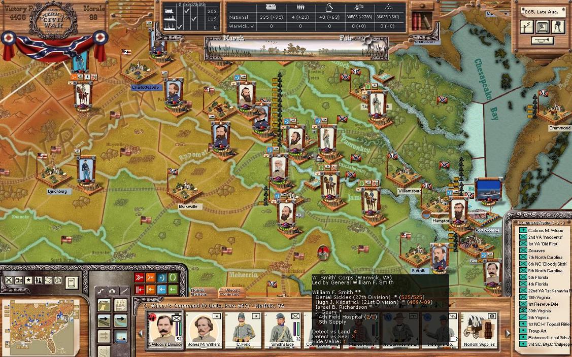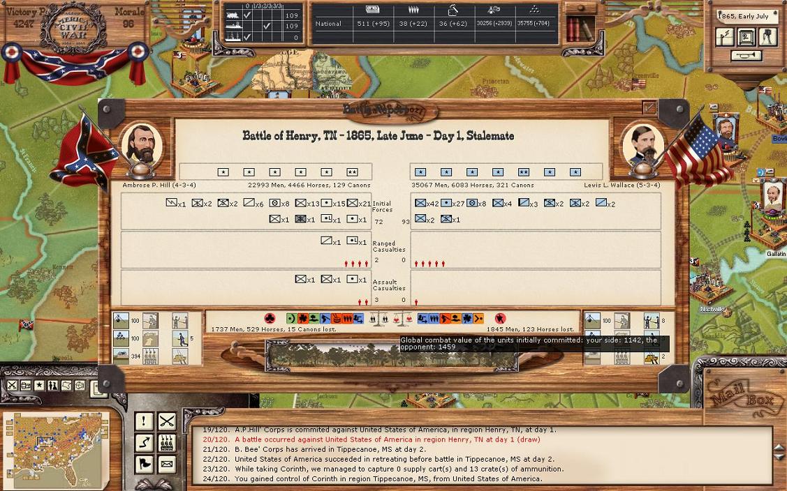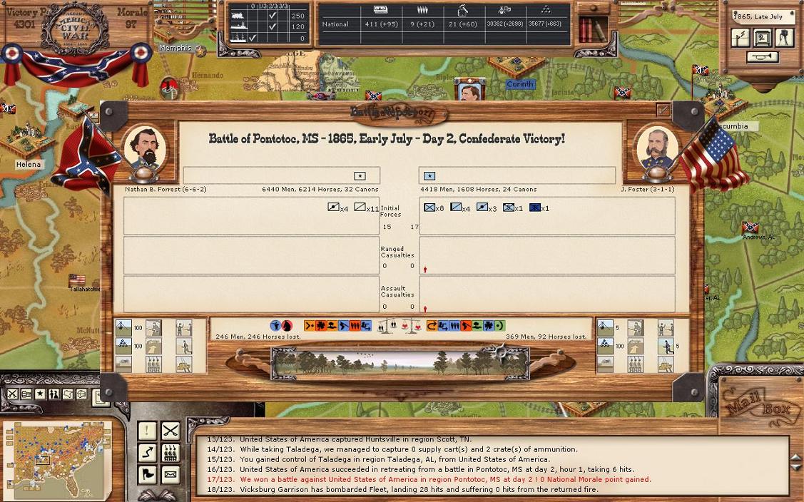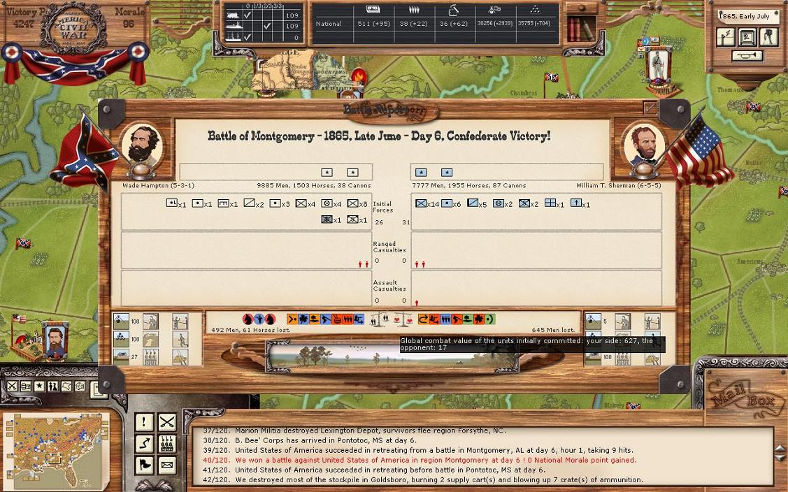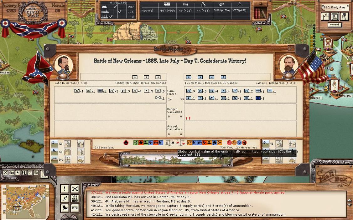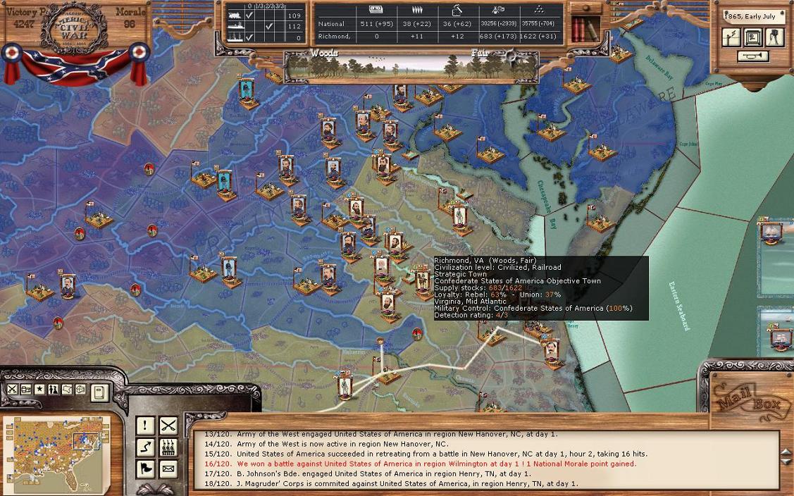 Confederate wrote:Charles, I have to congratulate you for making it to June 1865 and still being in the war, although he looks like Mortar is looking to launch an assault at Richmond. Good thing you have the genius defensive man Longstreet in Richmond with Lee not too far. Doesn't look like he'll be able to pass anytime soon![]()