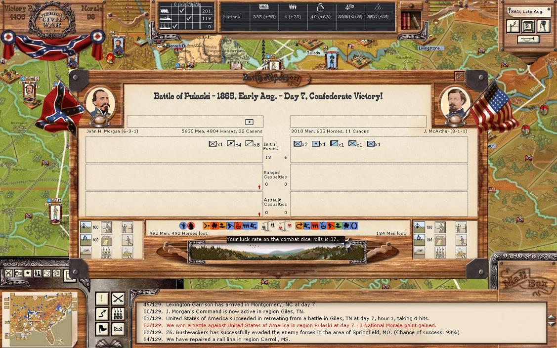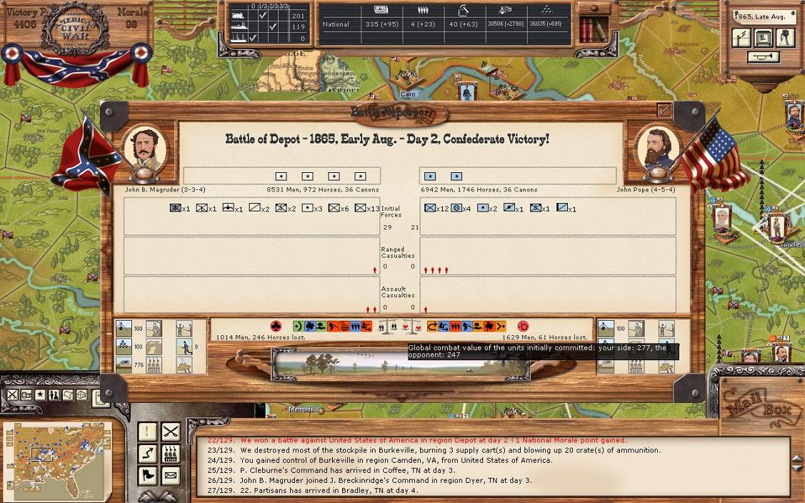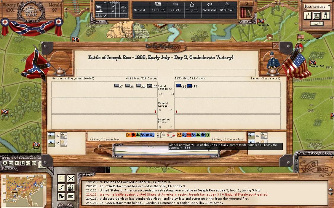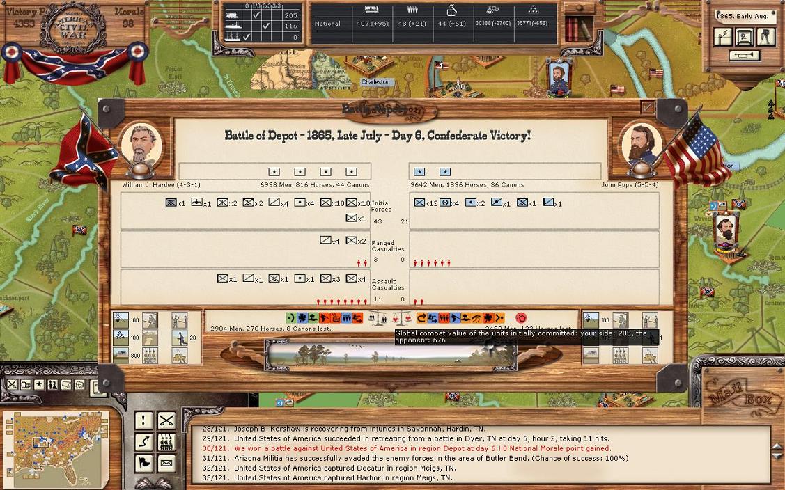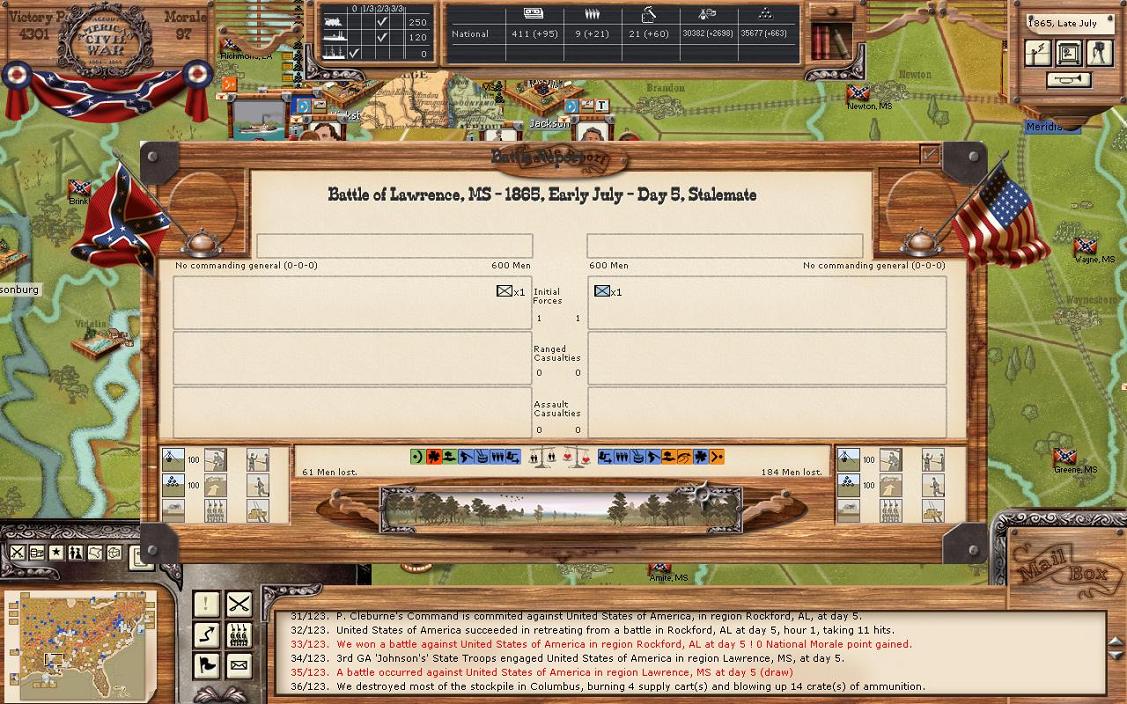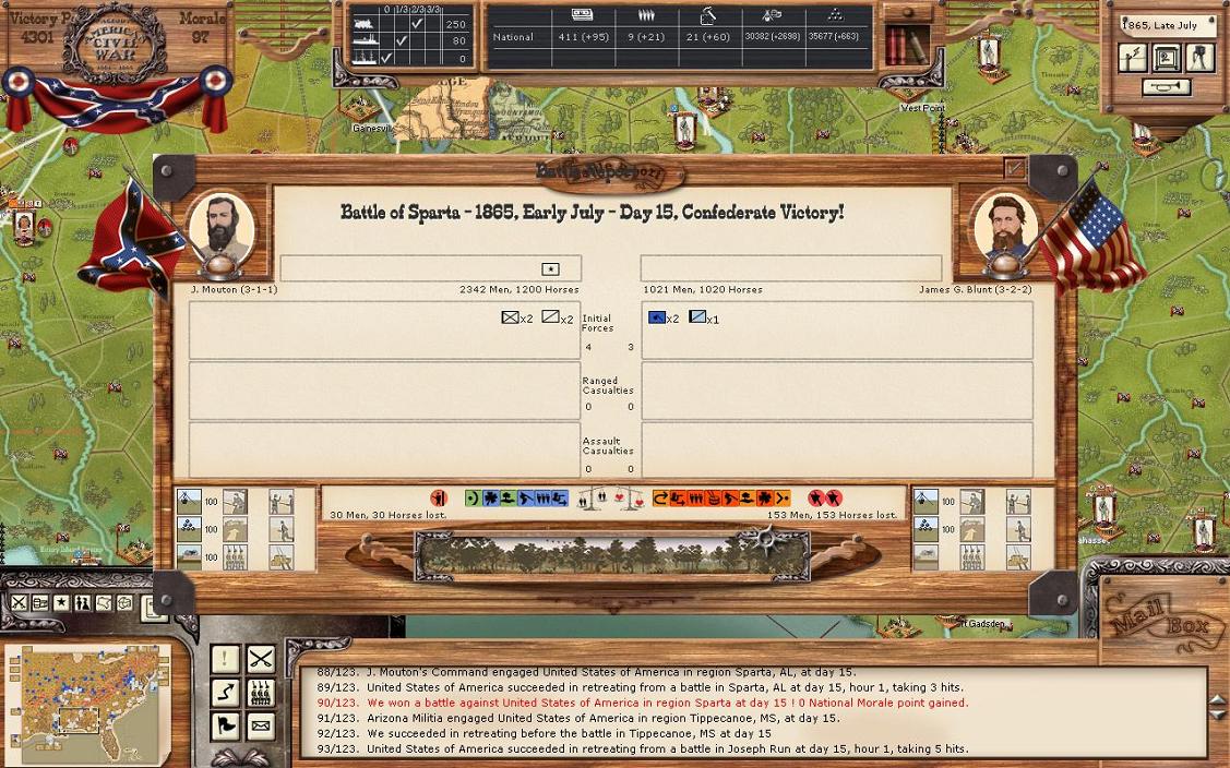 Confederate wrote:Charles, I have to congratulate you for making it to June 1865 and still being in the war, although he looks like Mortar is looking to launch an assault at Richmond. Good thing you have the genius defensive man Longstreet in Richmond with Lee not too far. Doesn't look like he'll be able to pass anytime soon![]()