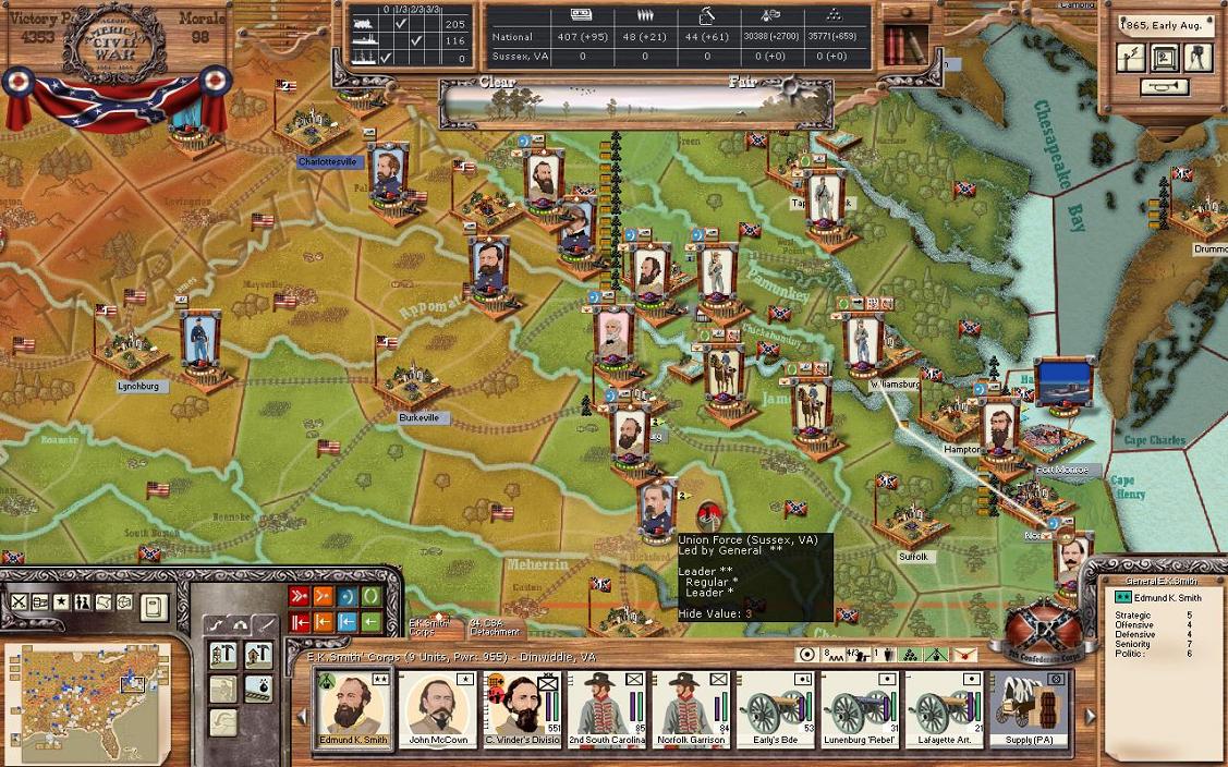 Confederate wrote:Charles, I have to congratulate you for making it to June 1865 and still being in the war, although he looks like Mortar is looking to launch an assault at Richmond. Good thing you have the genius defensive man Longstreet in Richmond with Lee not too far. Doesn't look like he'll be able to pass anytime soon![]()